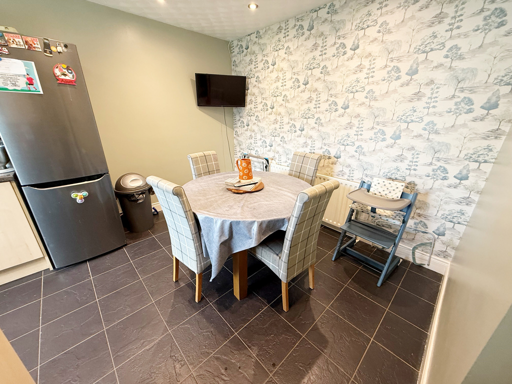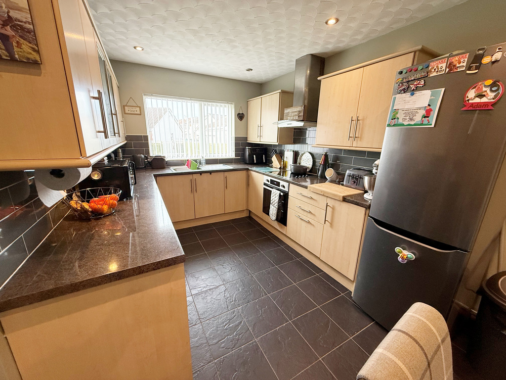 High and low level storage units, stainless steel sink and drainer unit, integrated oven and hob with extractor fan over. Space for fridge freezer and dishwasher. TV point. Part tiled walls and tiled floor.