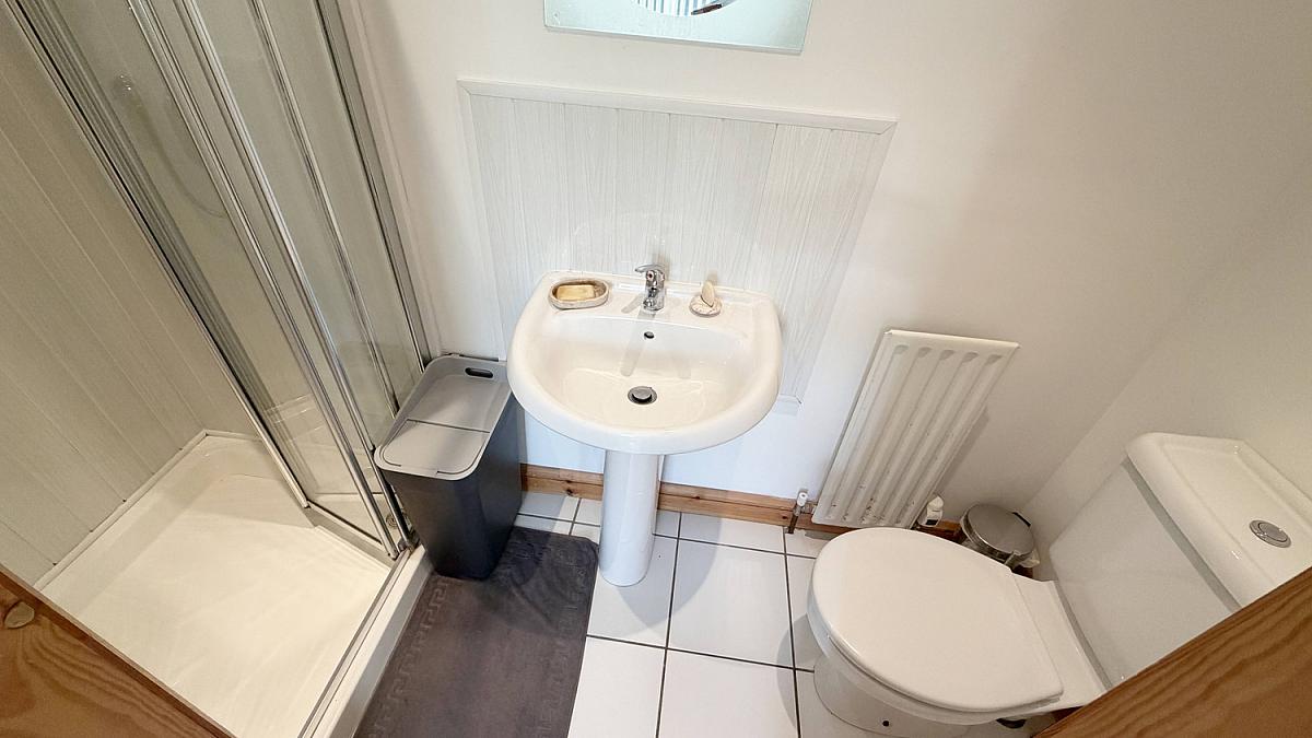 Tiled floor with low flush WC, pedestal wash hand basin and shower cubicle with mains shower.
