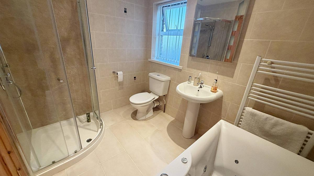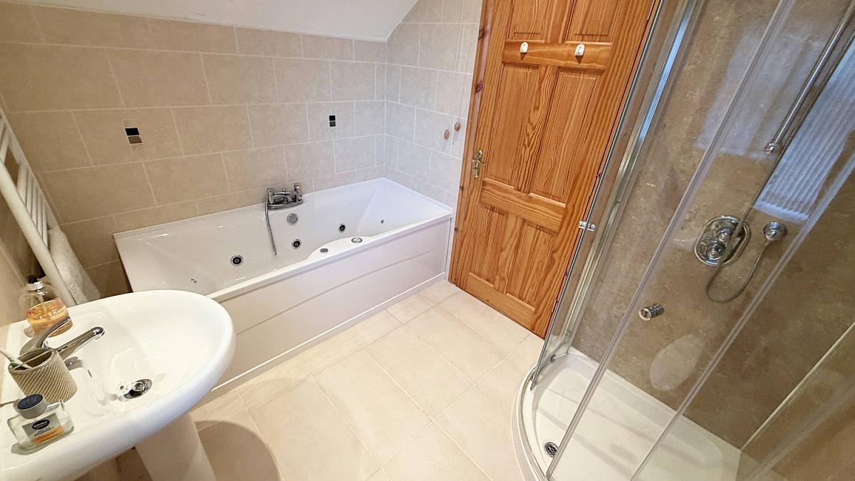 Tiled floor with fully tiled walls. Low flush WC and pedestal wash hand basin. Jacuzzi bath, shower cubicle with mains shower and heated towel rail.