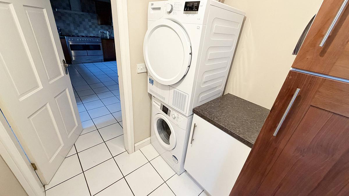Tiled floor, plumbing for a washing machine, space for a tumble drier. Access to side garden