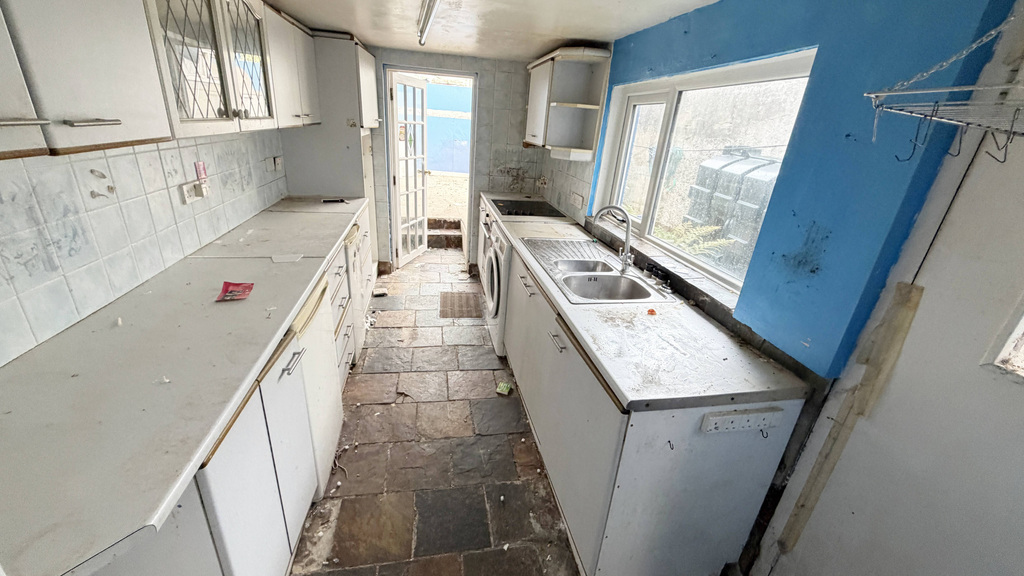High and low level storage units, integrated oven hob and extractor fan, stainless steel sink and drainer unit. space for washing machine. Access to yard.