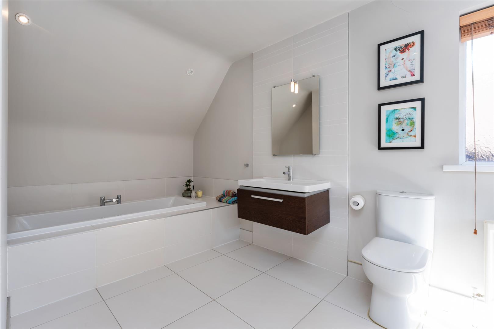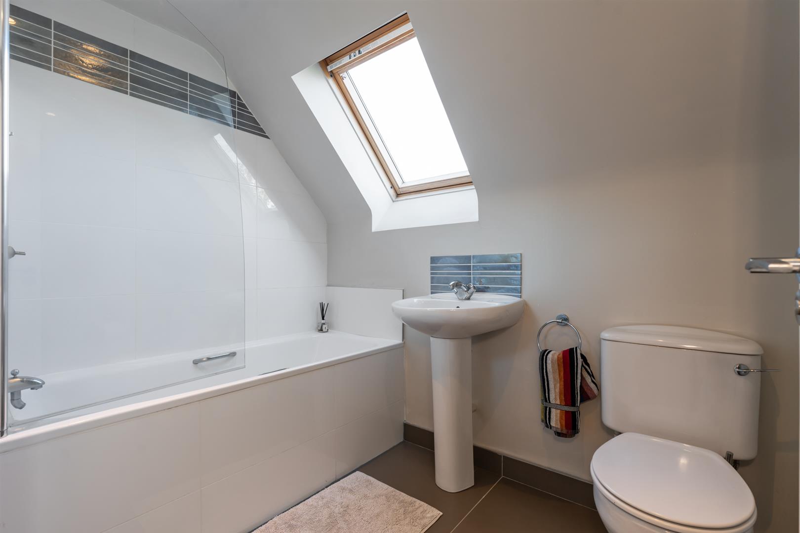 White suite comprising panelled bath with overhead shower and glazed screen, low flush wc, pedestal wash hand basin with mixer tap and tiled splashback, part tiled walls, tiled flooring, Velux type window.
