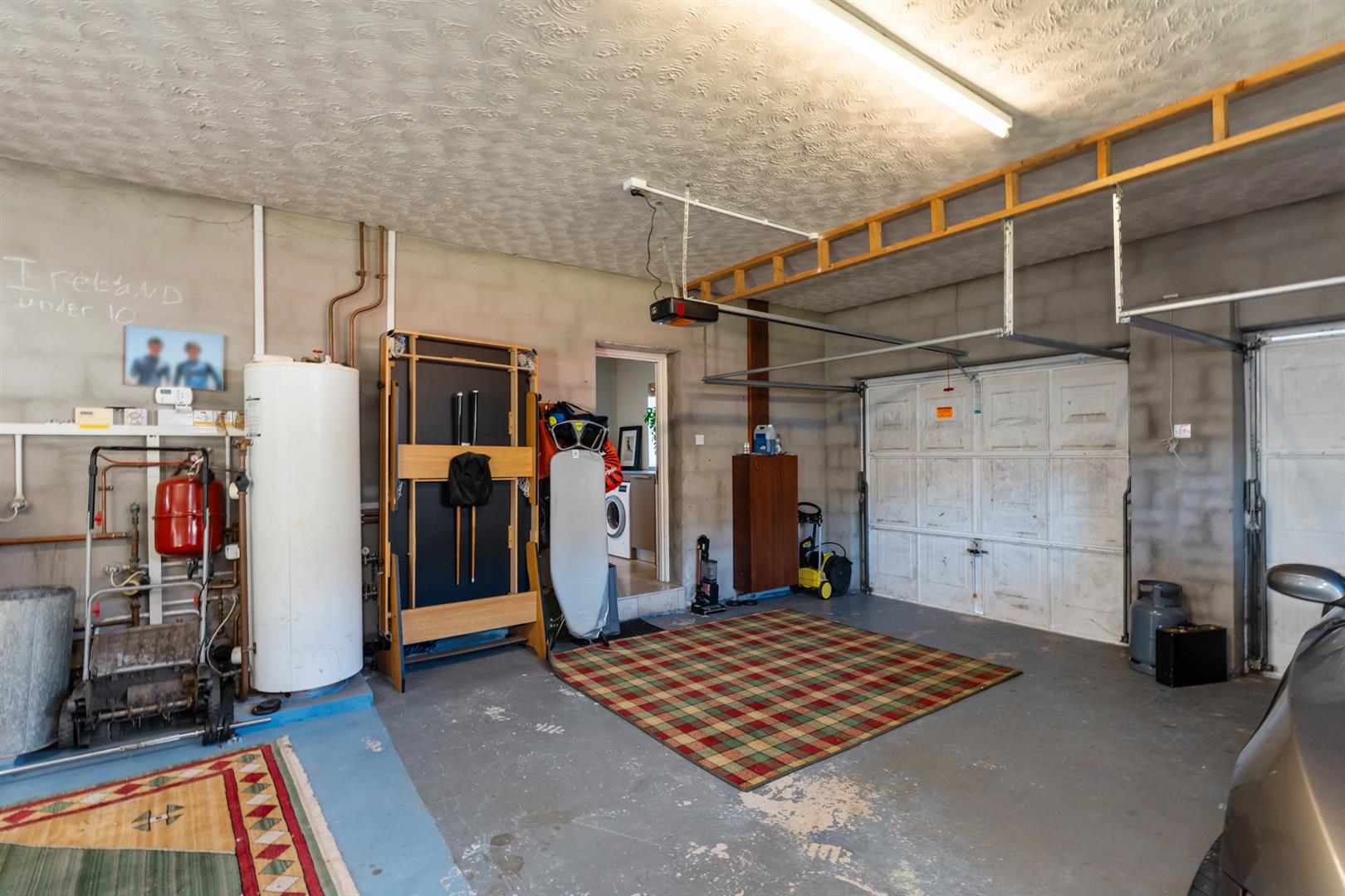 Four car garage, double electric doors, built in storage, Grant oil fired boiler, door to rear garden.