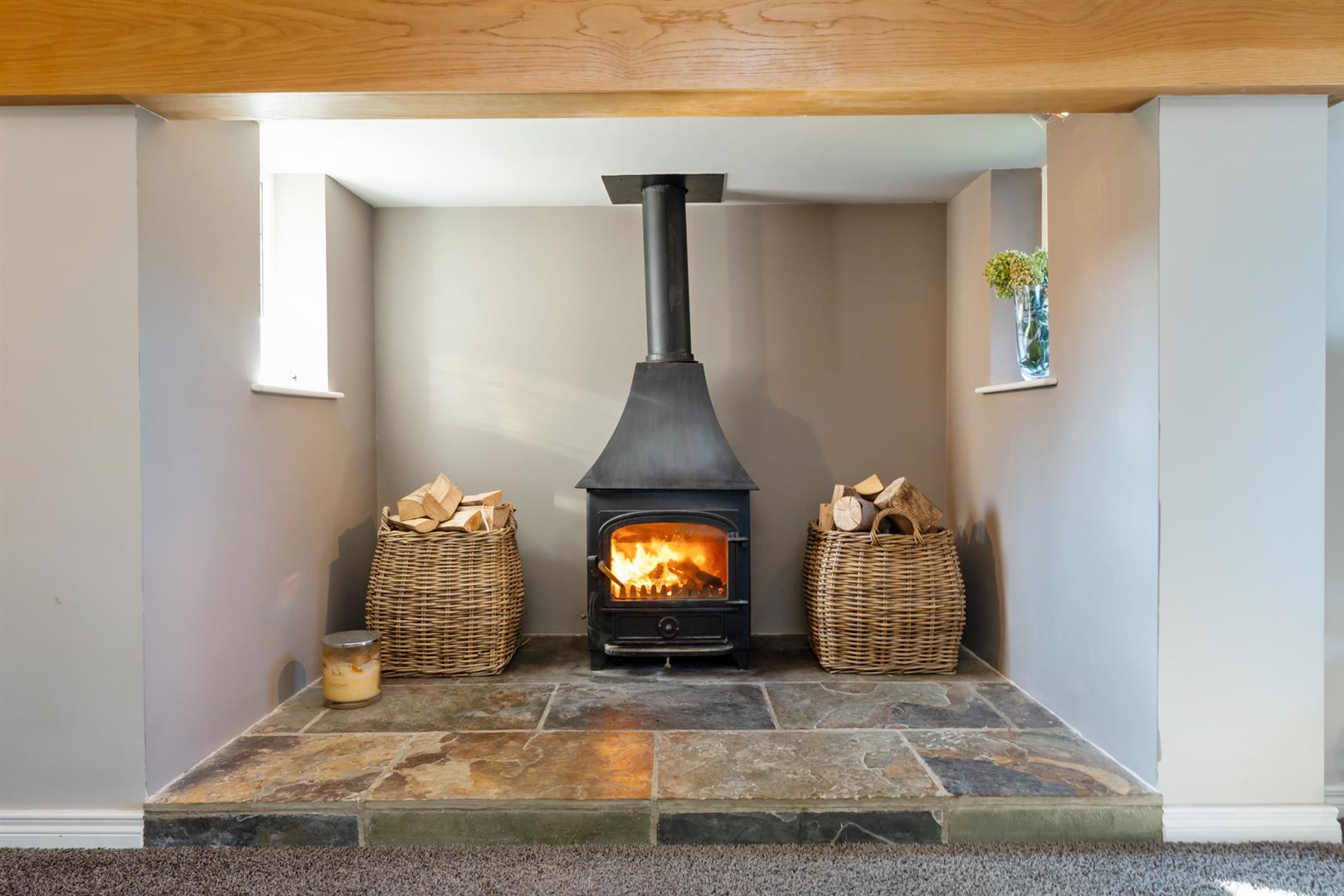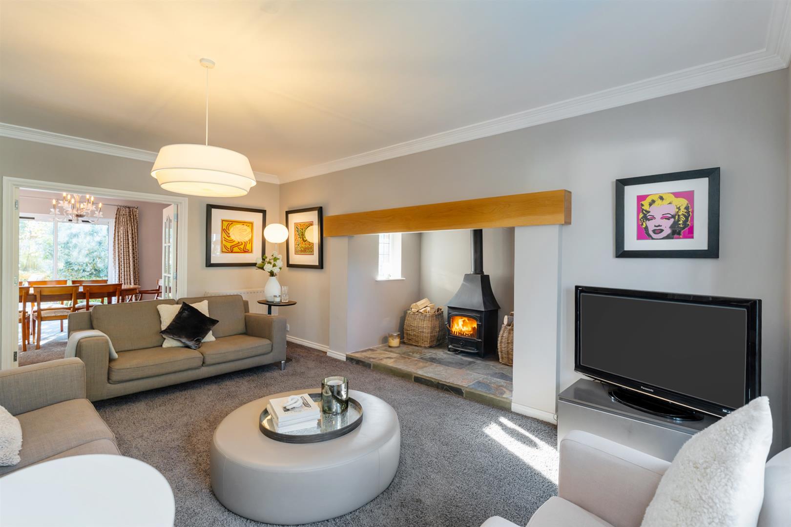 Bay window, Inglenook style fireplace with tiled hearth, feature wood burning stove and wooden mantle, corniced ceiling, double doors to dining room.