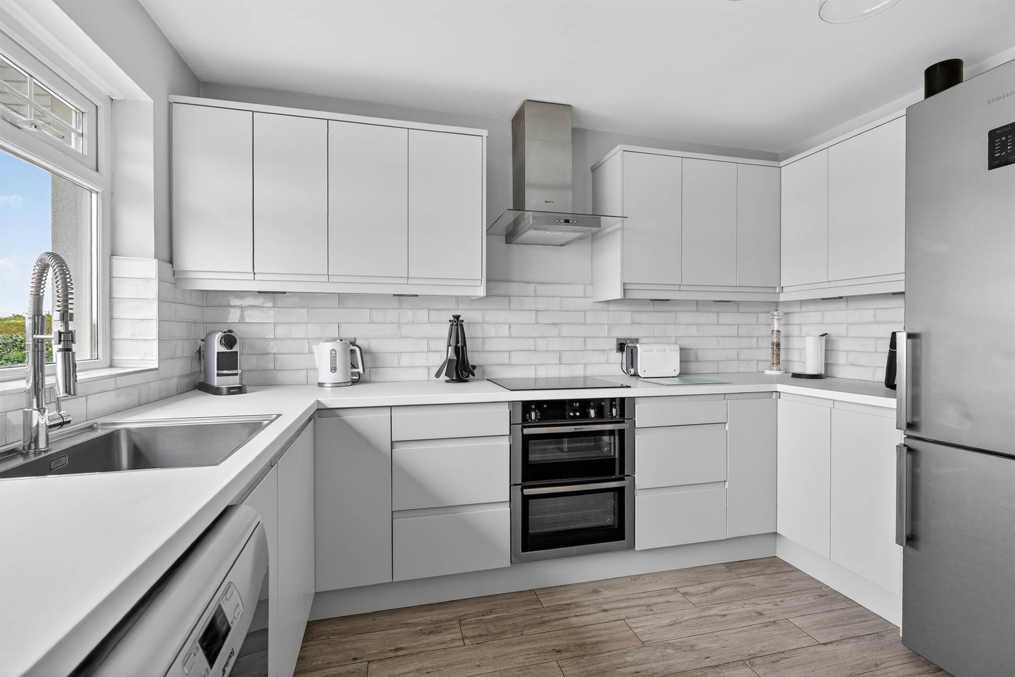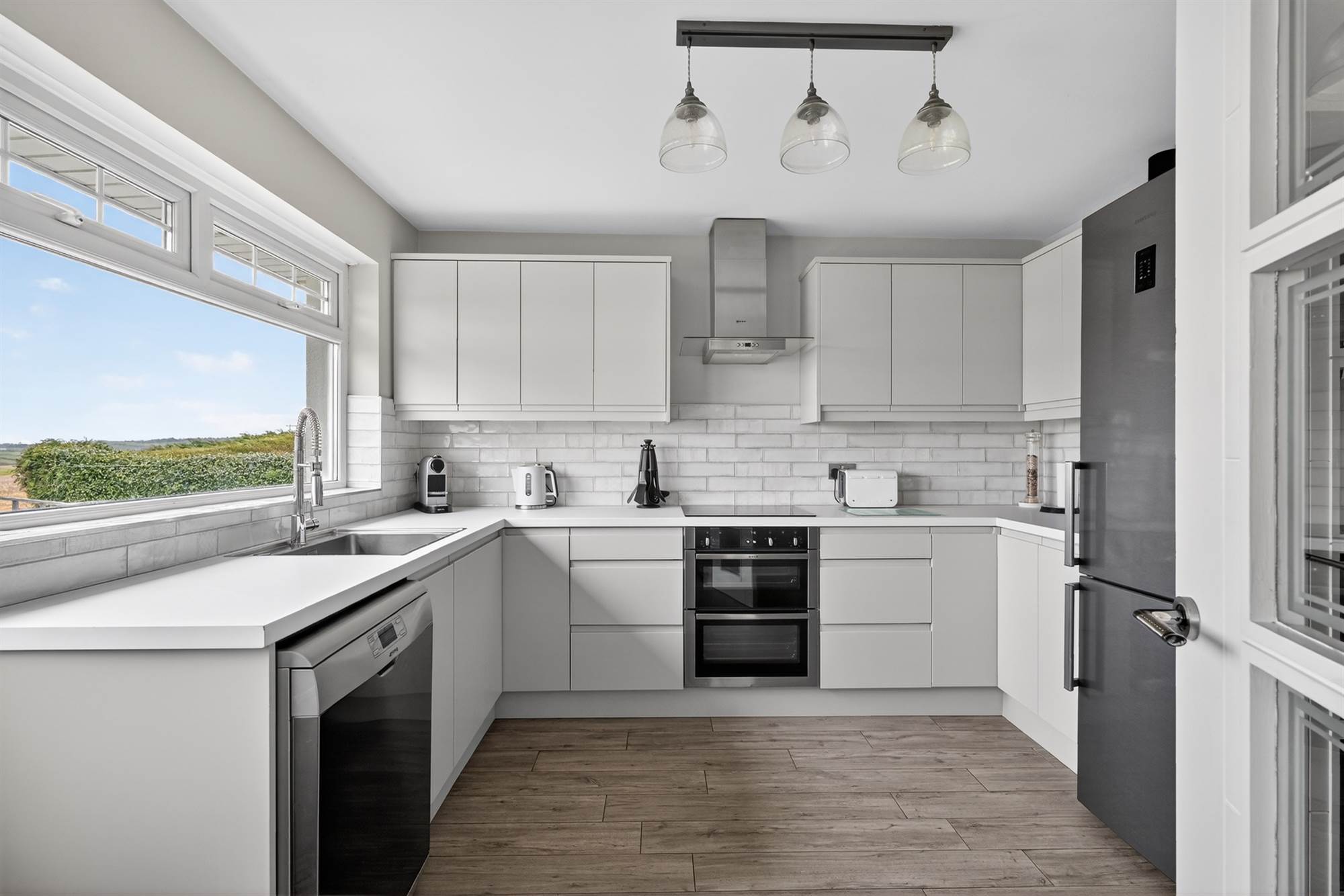 Contemporary fitted kitchen with excellent range of high and low level units, Franke stainless steel sink with detachable mixer tap, built-in Neff oven and grill, stainless steel extractor fan, space for dishwasher, space for fridge freezer, laminate worktops, part tiled walls and sills, concealed lighting, overlooking rear garden with views extending to countryside.