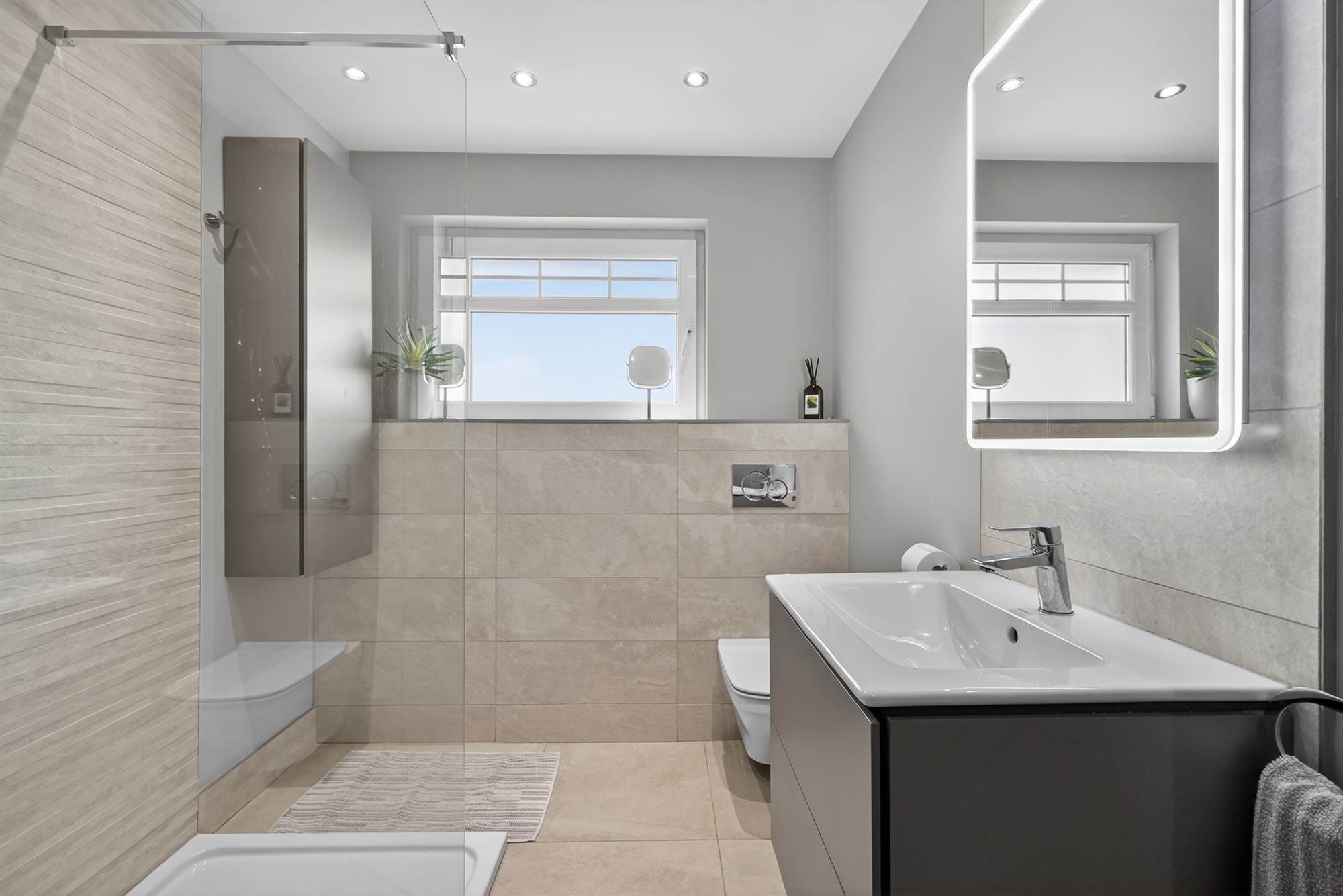 Comprising fully tiled built-in shower cubical with power shower and tiled shelf recess, wash hand basin with mixer tap and low level drawer, tiled splashback, wired LED mirror, close coupled wc, heated towel rail, ceramic tiled floor, fully tiled walls, low voltage spotlights, extractor fan.