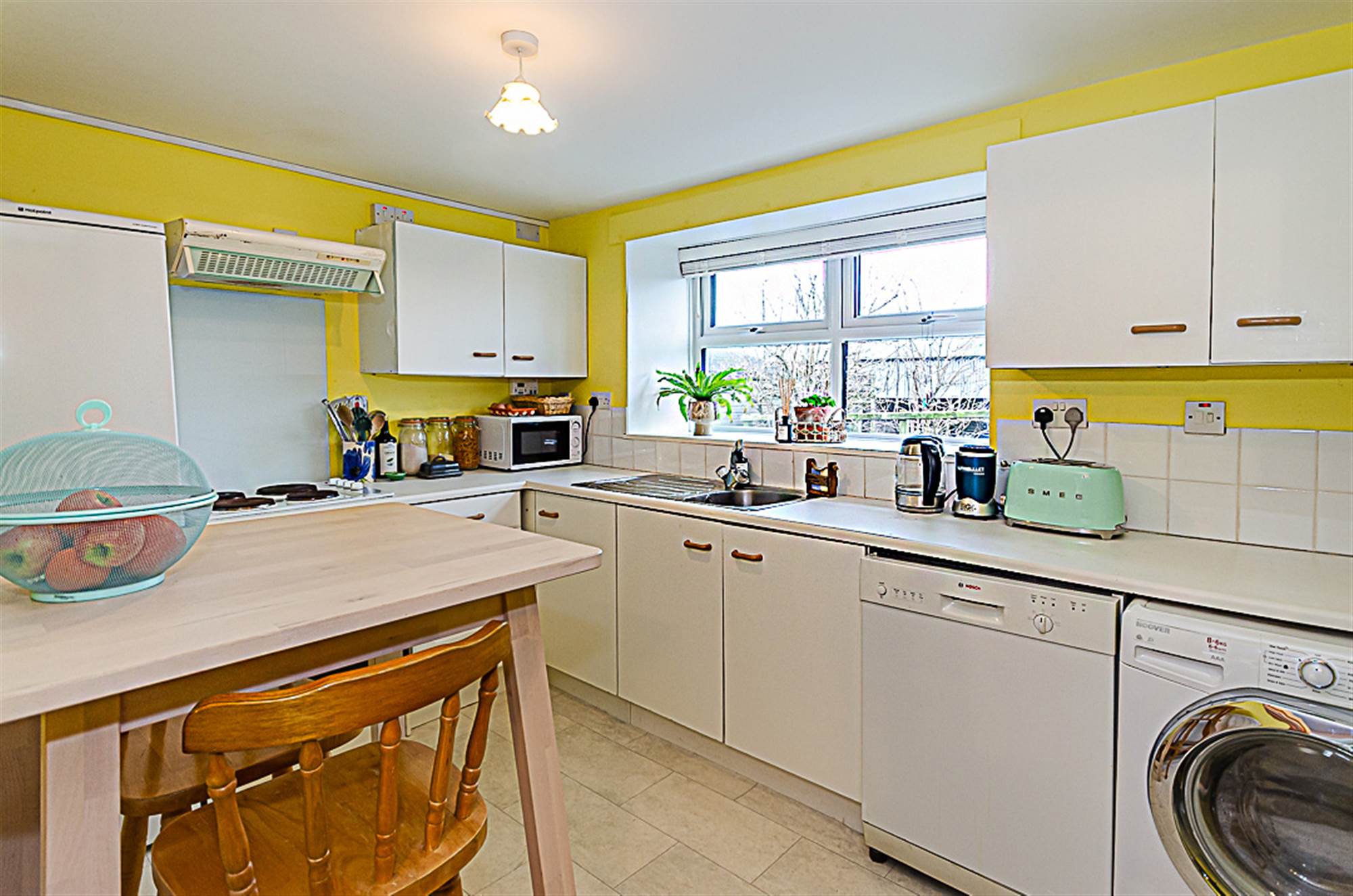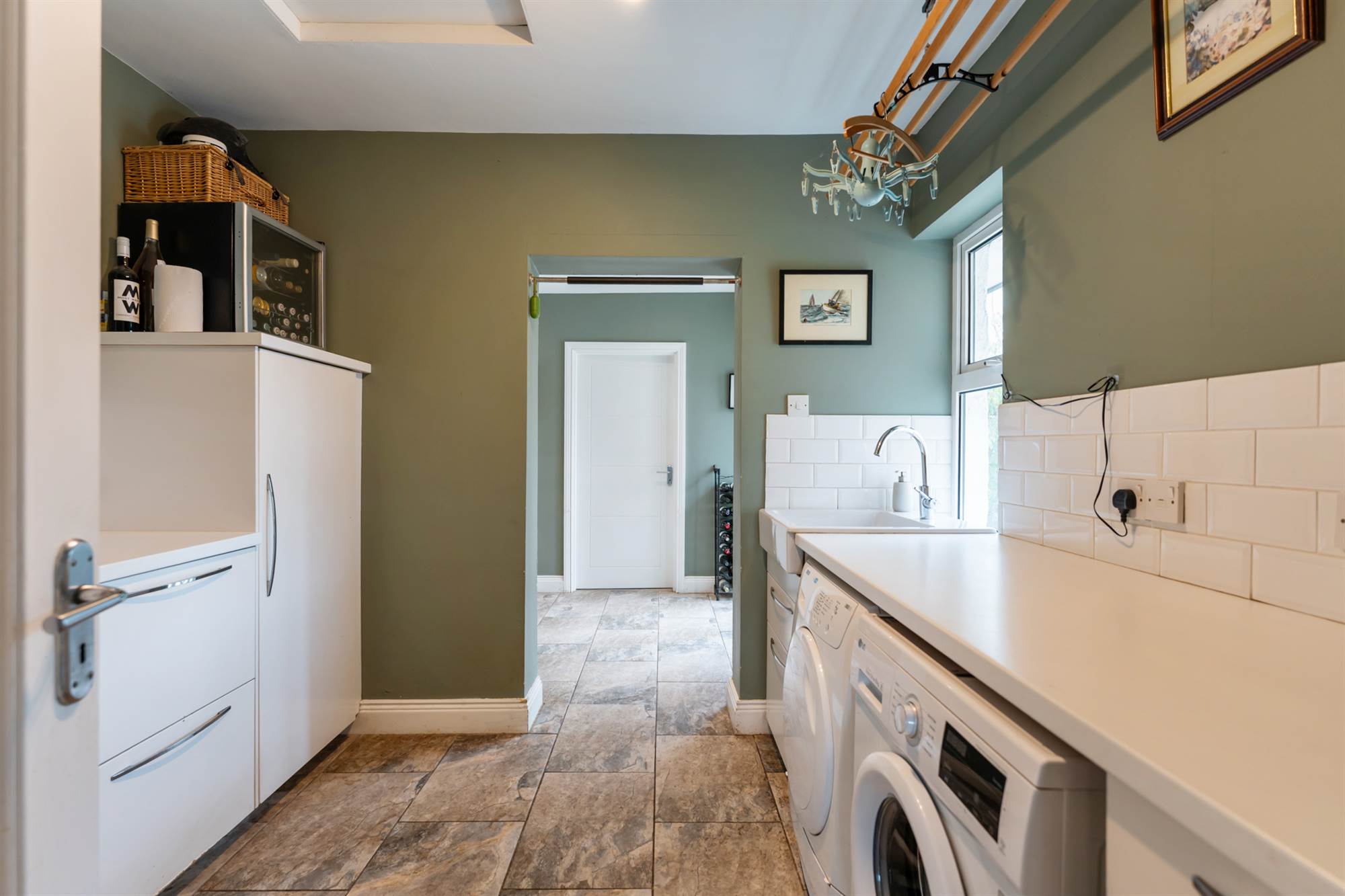 Plumbed for washing machine, storage space, ceramic Belfast sink, subway tiling. Floor tiling.