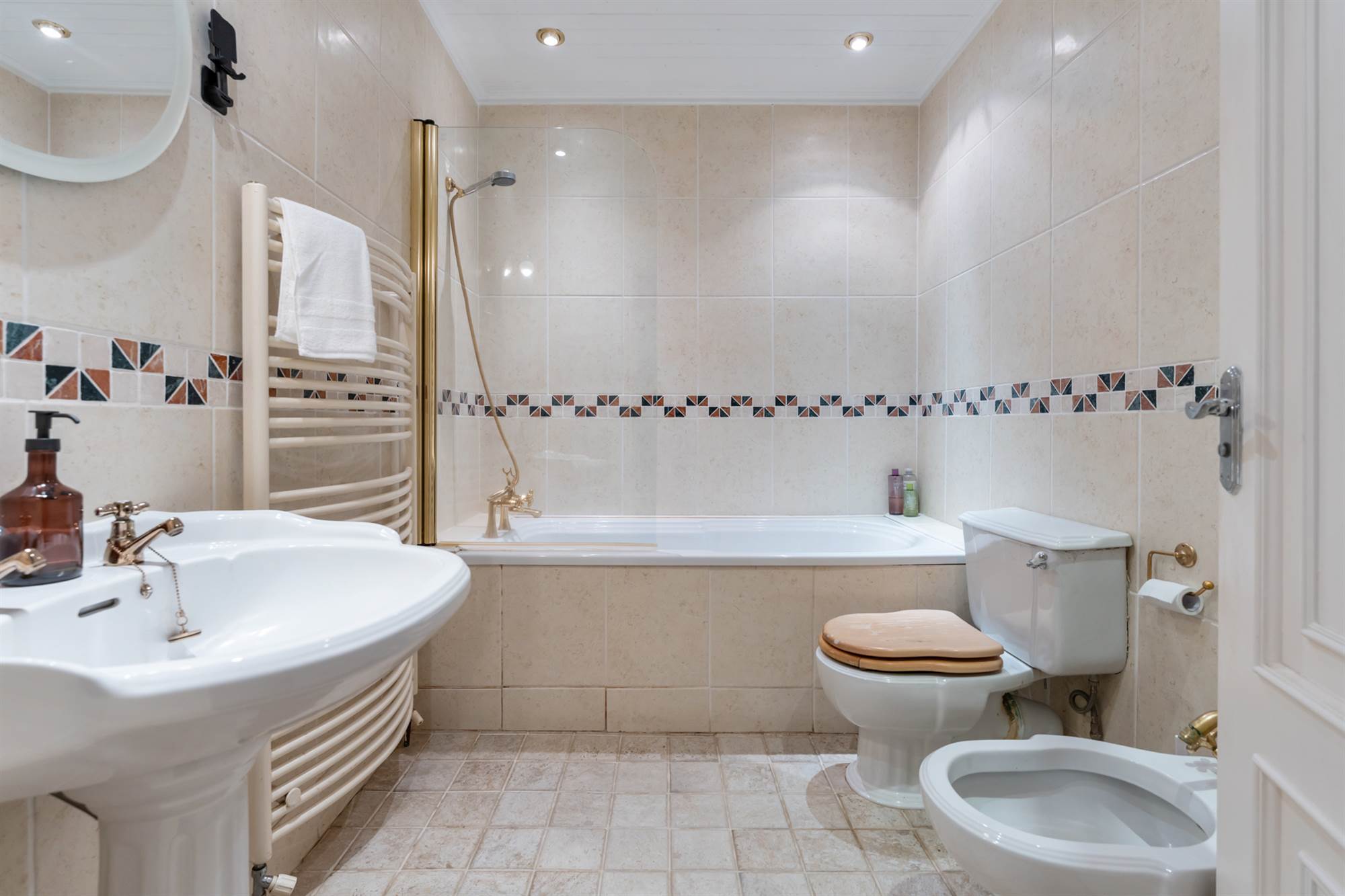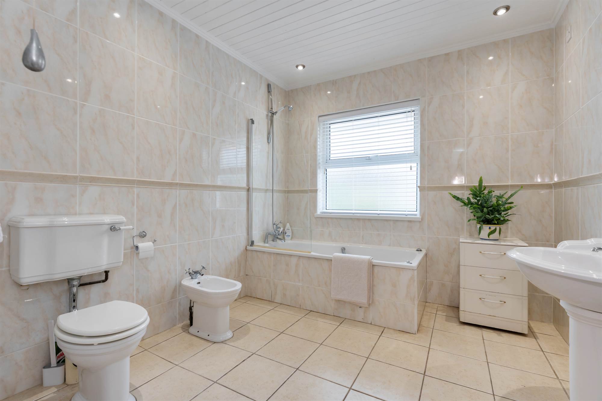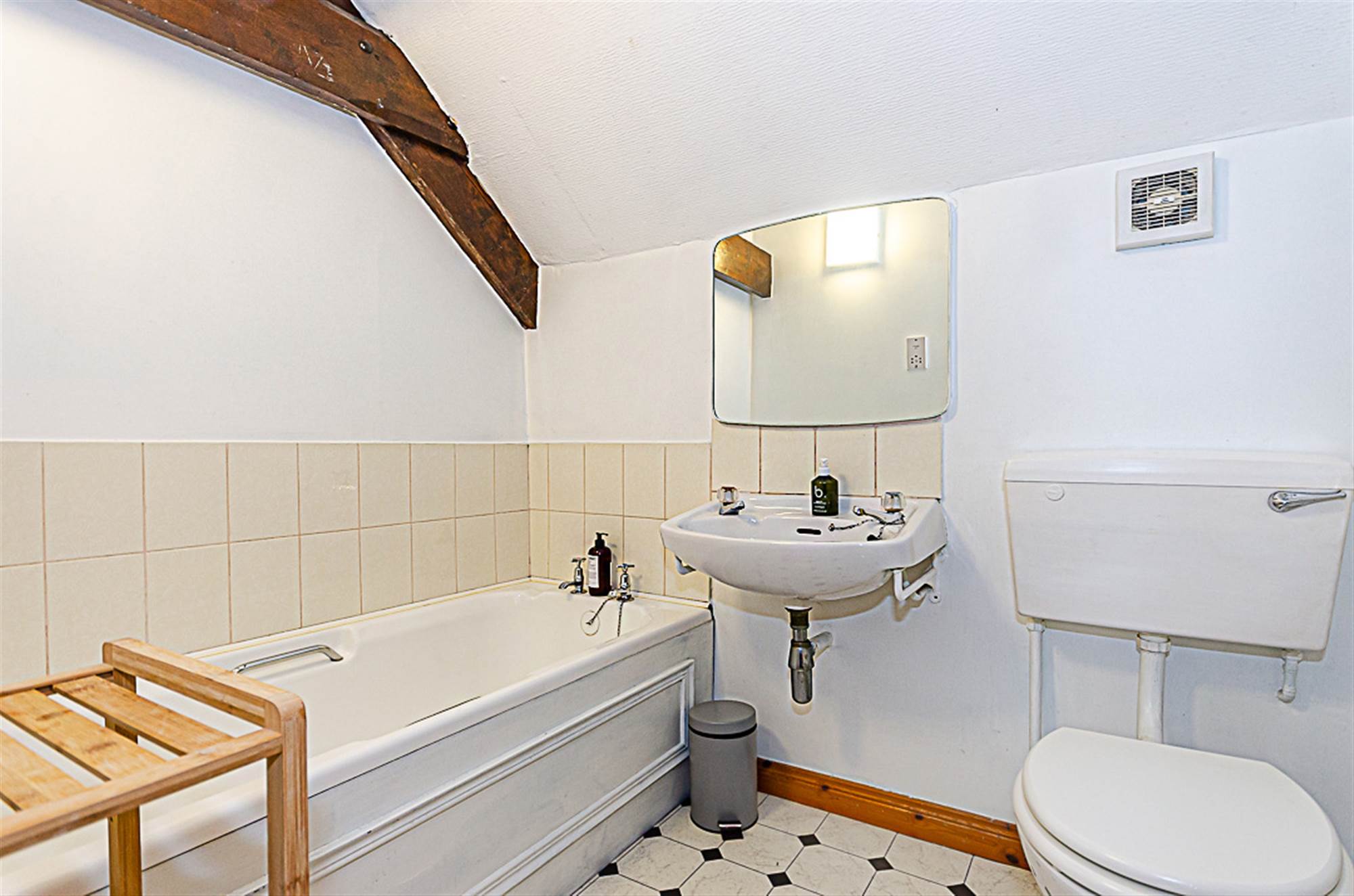 Spacious bathroom with bath, wash hand basin, wc and fully tiled.