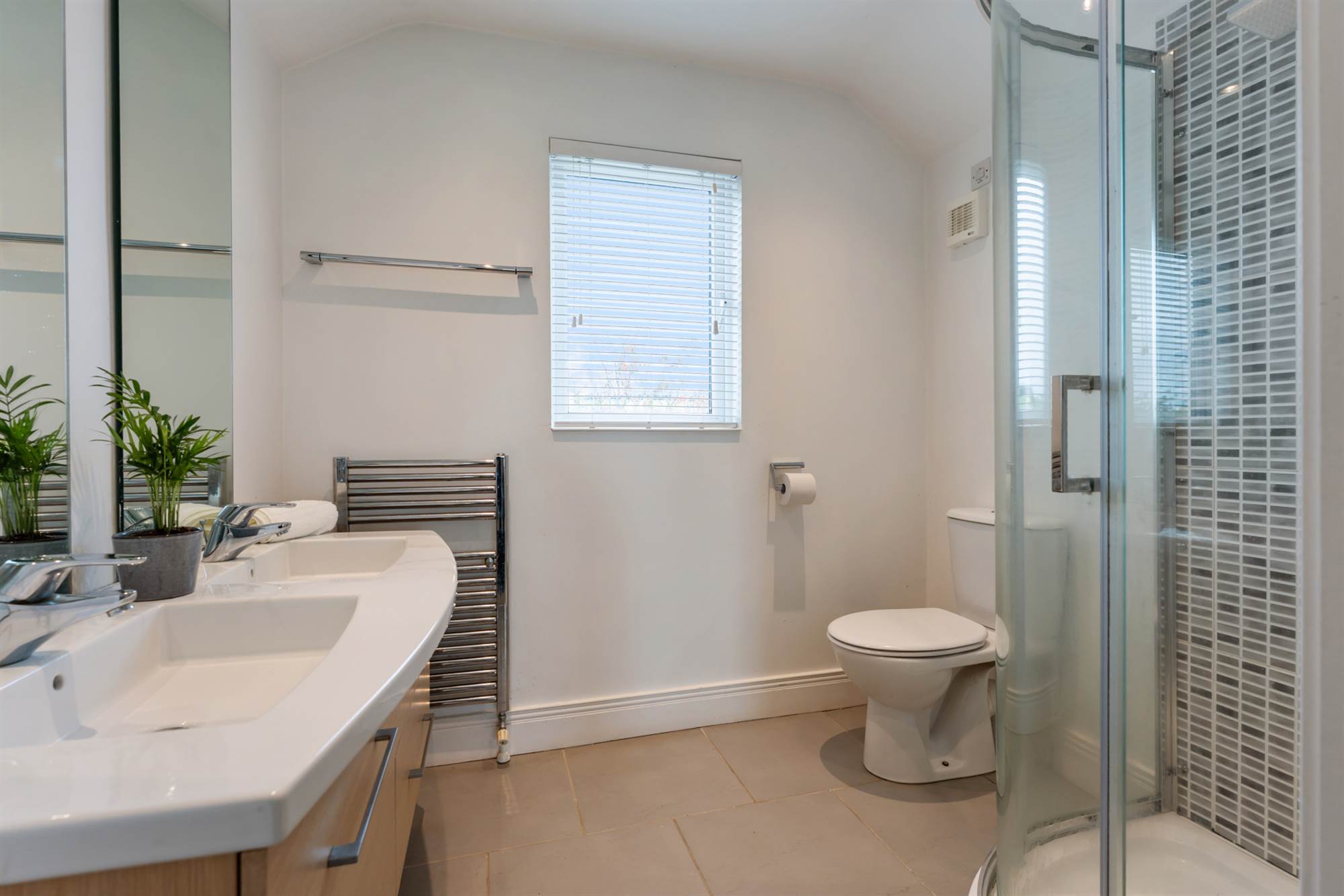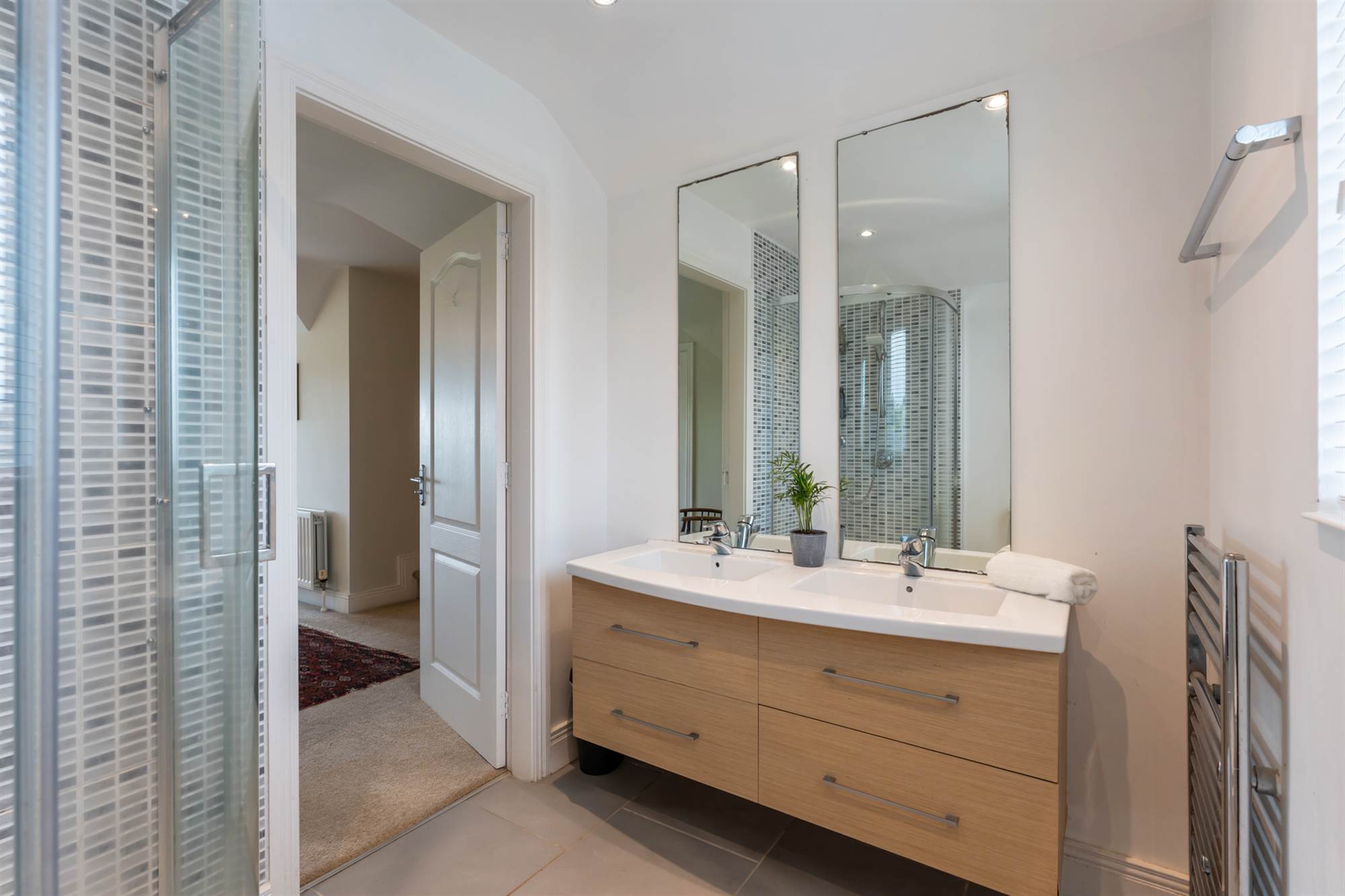 Attractive ensuite with to include double vanity unit sinks, power shower, chrome towel rail and low level WC.