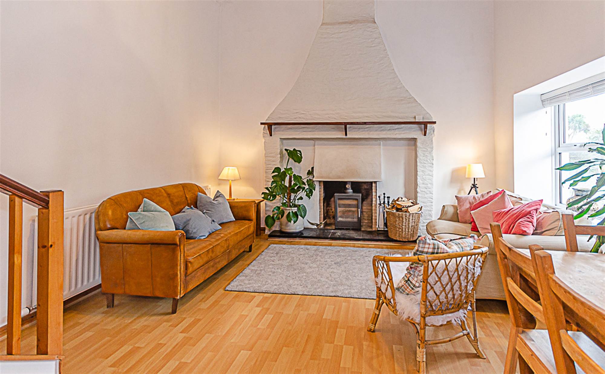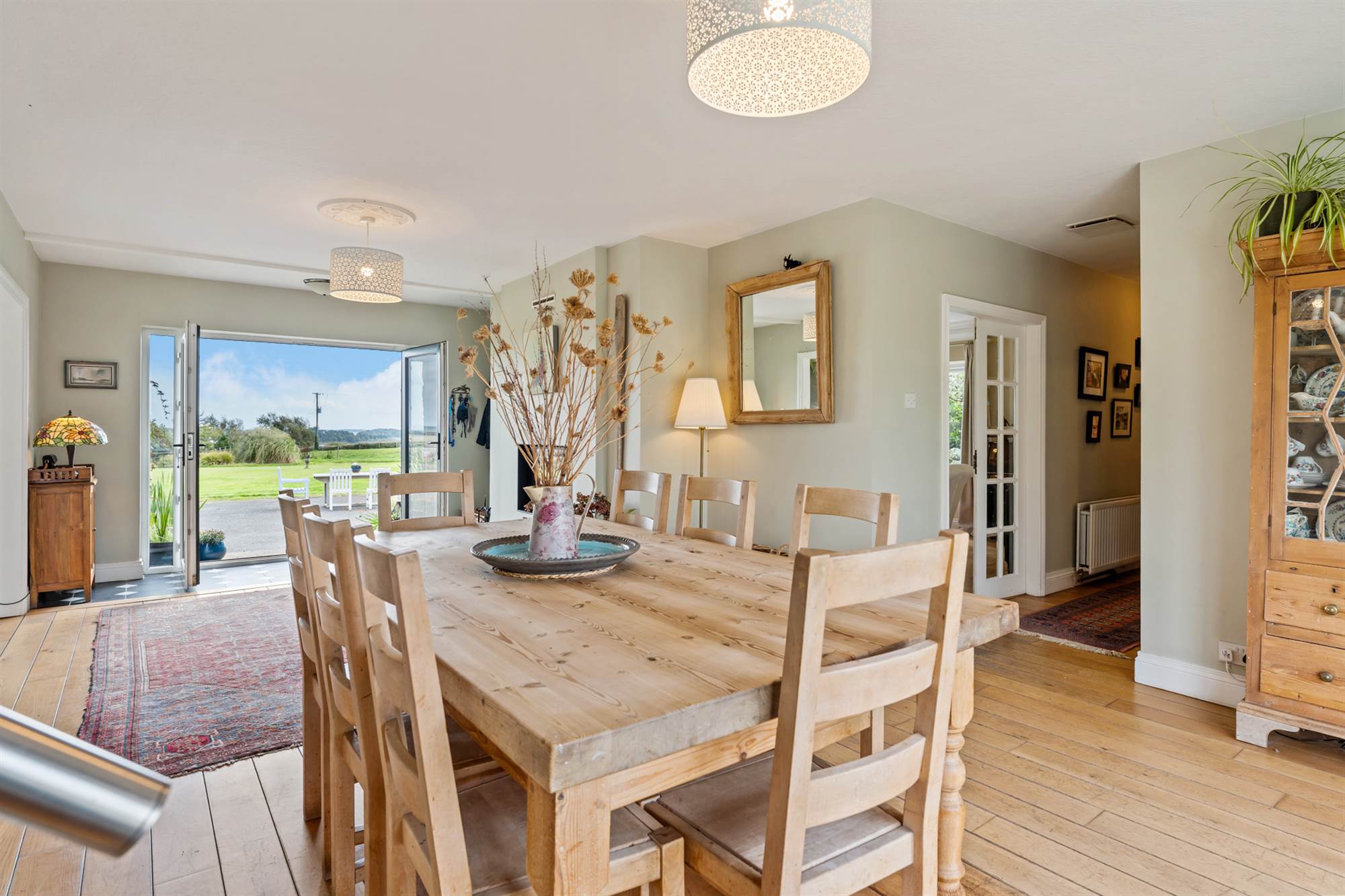 Step into this bright and spacious reception/dining hall leading from the front to the back of this home and into the kitchen which flows beautifully for entertaining. Solid wooden flooring, featuring the Fondis Ulys 900 would burning double stove fire.