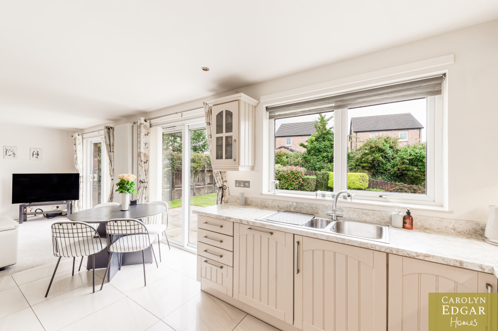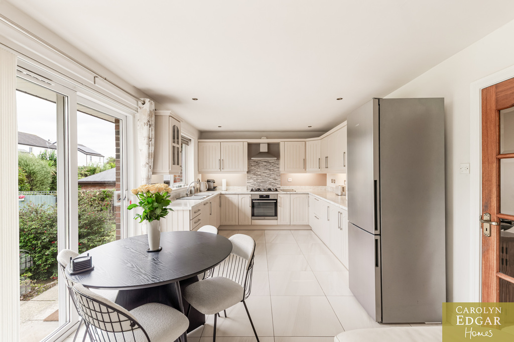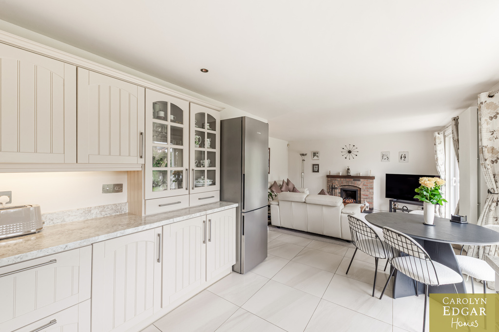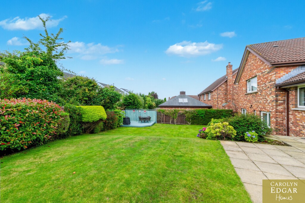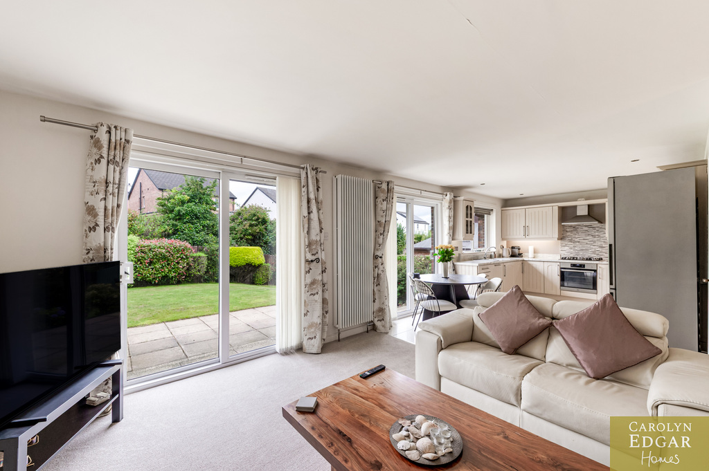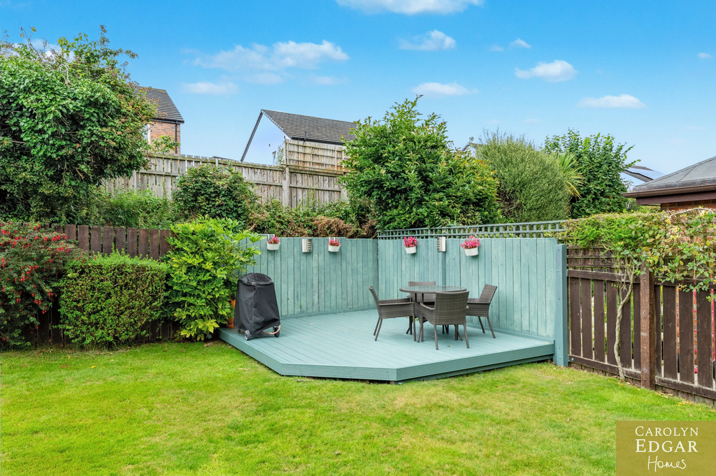 Neutrally decorated throughout and split over three floors the property boasts a spacious and flexible layout providing versatile living accommodation for any growing family needs with the adaptability of four or five bedroom or extra reception rooms to suit whatever your requirements. Internally the property comprises of bright entrance hallway, extensive lounge with bay window and feature open fireplace, adjacent to this is a second reception room that currently serves as a formal dining area, ideal for hosting family gatherings and special occasions or possible fifth double bedroom if required. The heart of the home is undoubtedly the large, open plan modern fitted kitchen with an ample range of built in appliances leading to the spacious but cozy snug with fireplace that adds a sense of warmth and character, and patio doors overlooking the well maintained sunny rear gardens. There are three further double bedrooms all with built in robes on the next split upper level, master with ensuite and large family bathroom that caters to the remaining bedrooms. The split level to the lower floor has a further double bedroom, currently being used as a study, this floor also includes a utility room, additional W.C and convenient access to the double garage. Outside there are well maintained wrap around gardens to the front with brick paviour driveway providing ample off-street parking for several cars and access to the double garage. The expansive private enclosed gardens complete with well-kept lawns, an array of mature trees and shrubs and decked sun terrace are designed for relaxation and entertainment, making this the perfect home with a great balance of both great outdoor and indoor living space with the ideal blend of comfort, style, and convenience for family living.