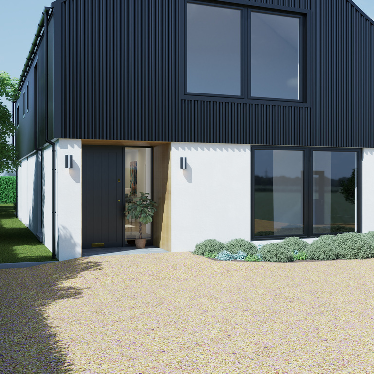 Designed to the highest standard throughout, this striking home combines modern architectural style with spacious, thoughtfully planned accommodation, combining stylish interiors and well-designed outdoor areas creating a blend of comfort, functionality and modern design. The exterior showcases a contemporary finish, with dark grey corrugated cladding to the upper walls and roofline, complemented by crisp white rendered lower walls, the rear sun terrace with composite decking is perfect for relaxing and enjoying the surrounding views. The detached double garage is designed to match the main house, with dark grey doors and windows to complement the cladding. The property is accessed via a gated entrance, adding extra privacy.