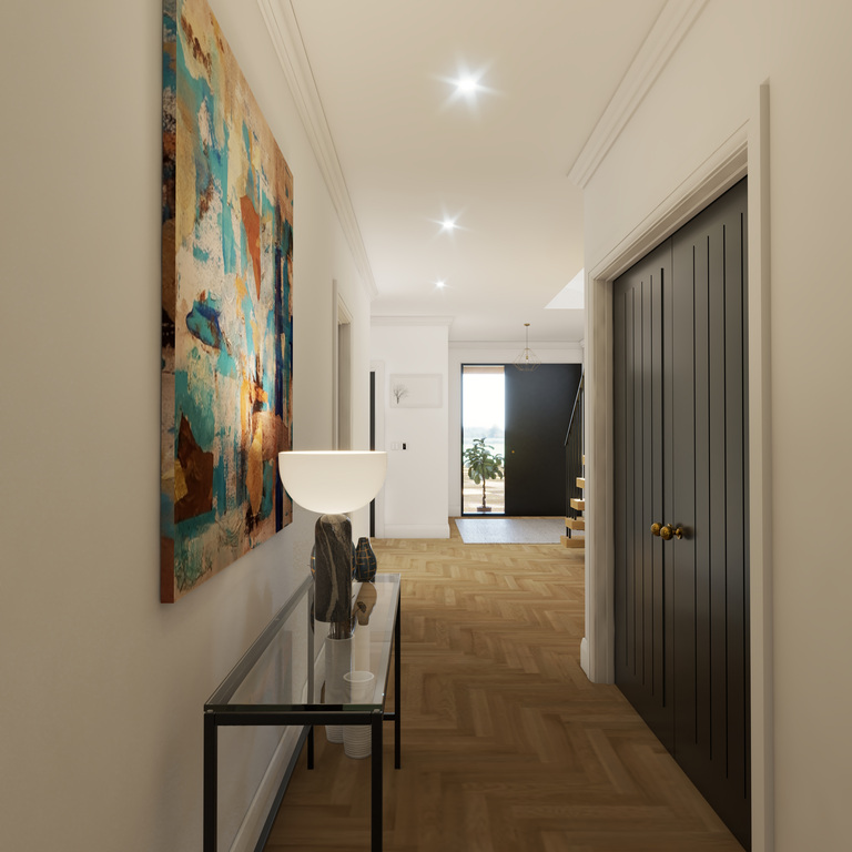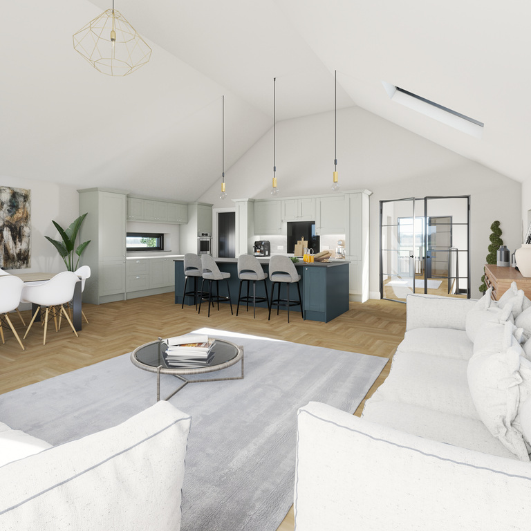 The upper level showcases an impressive open-plan living space designed for modern family life and easy entertaining. Featuring a vaulted ceiling flooding the room with natural light this magnificent area floods with natural light, the contemporary luxury fitted kitchen includes many extra features including large centre island and built-in pantry and flows seamlessly into the stylish living and dining area with Juliette balcony perfectly positioned to take full advantage of the elevated countryside views. Also on the first floor is spacious cinema/TV room, a separate study or home office, and an additional bathroom, providing excellent flexibility for modern living and working from home.