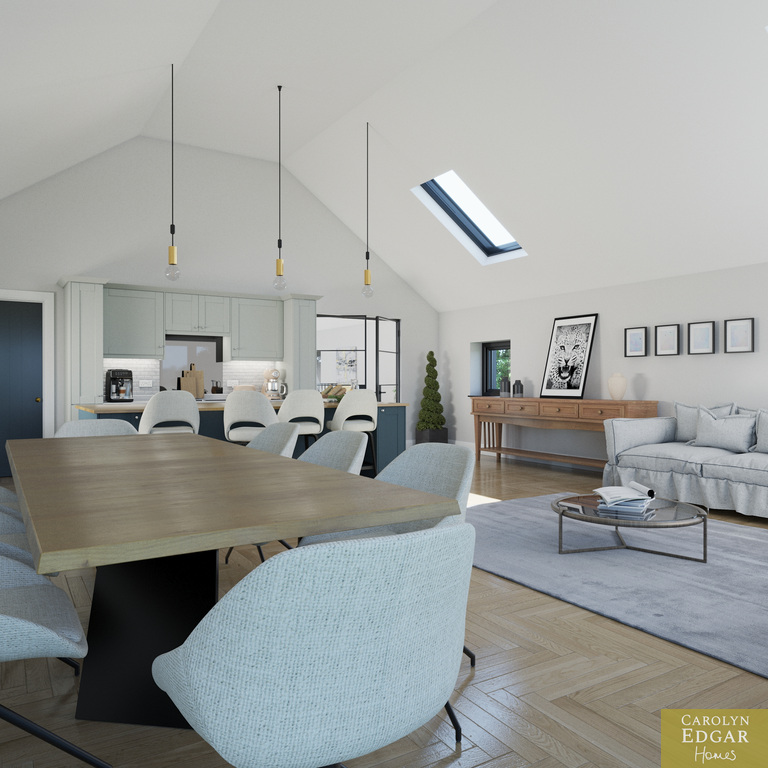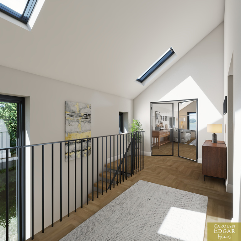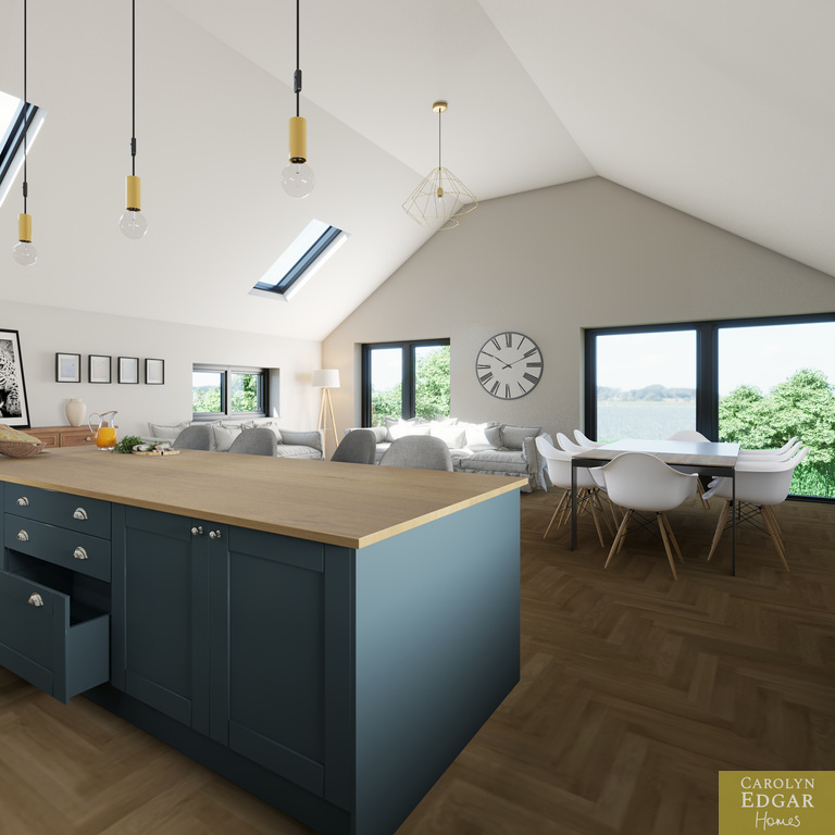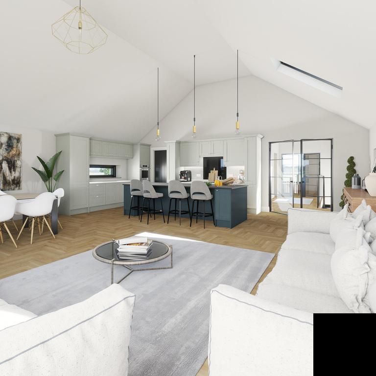 The upper level showcases an impressive open-plan living space designed for modern family life and easy entertaining. Featuring a vaulted ceiling flooding the room with natural light this magnificent area floods with natural light, the contemporary luxury fitted kitchen includes many extra features including large centre island and built-in pantry and flows seamlessly into the stylish living and dining area with Juliette balcony perfectly positioned to take full advantage of the elevated countryside views. Also on the first floor is spacious cinema/TV room, a separate study or home office, and an additional bathroom, providing excellent flexibility for modern living and working from home.