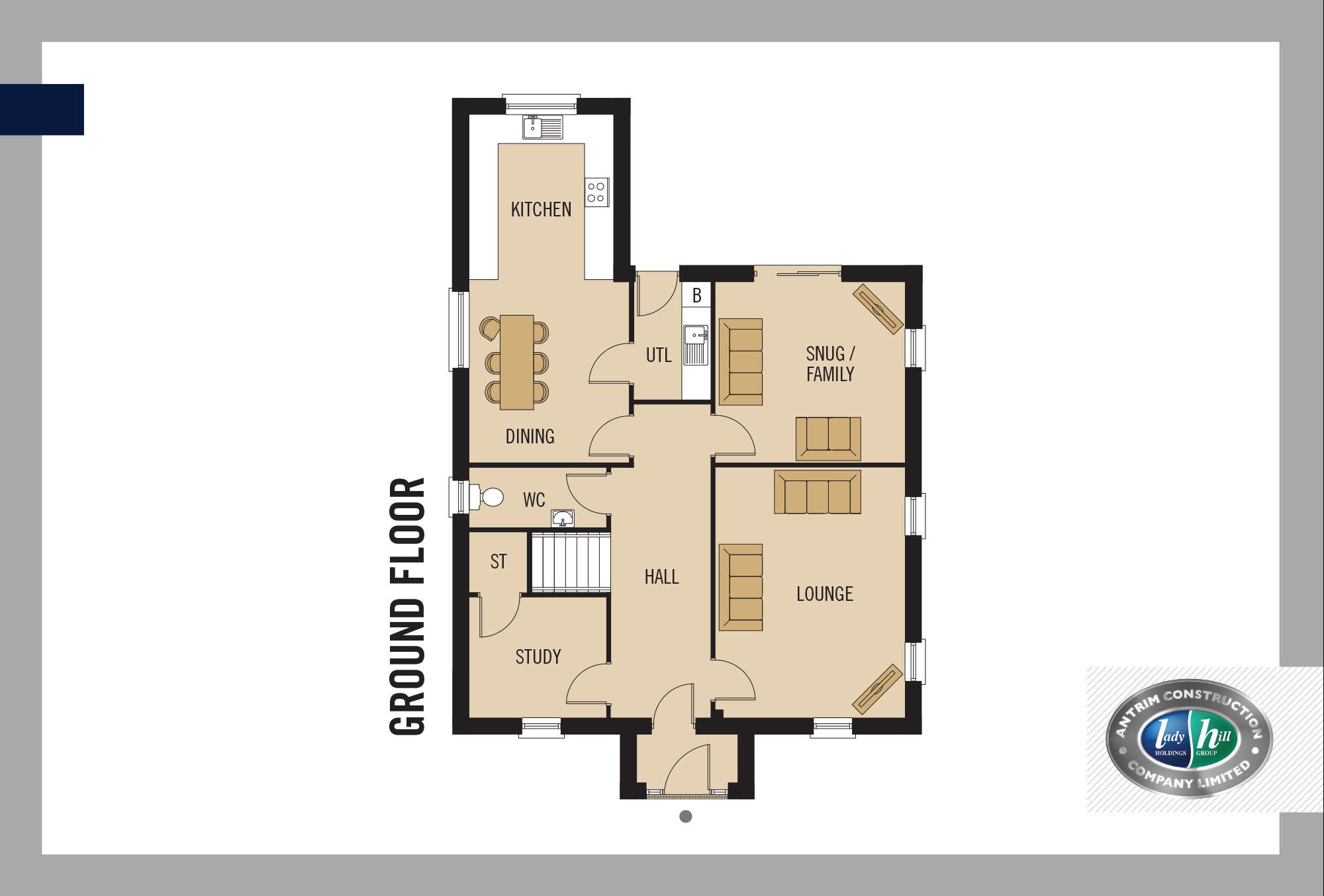 Walls are of traditional, tried and tested cavity construction. Brick and/or plaster render are used for the external finish. External timber features are painted to match where applicable. The roof will have a grey coloured, flat concrete tile crowned by a dry fixed ridge tile. uPVC round guttering with round uPVC downpipes compliment the external trim.