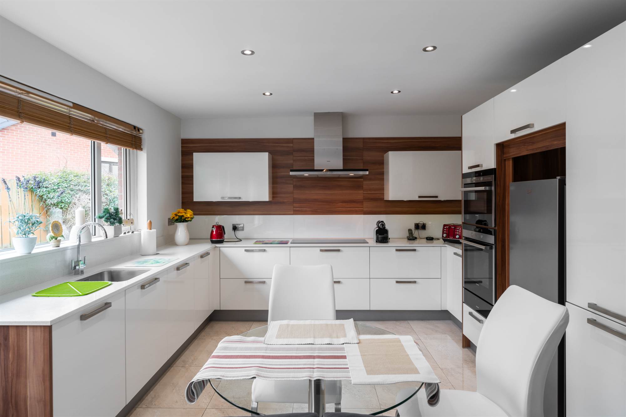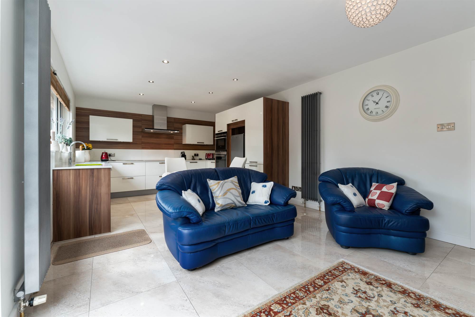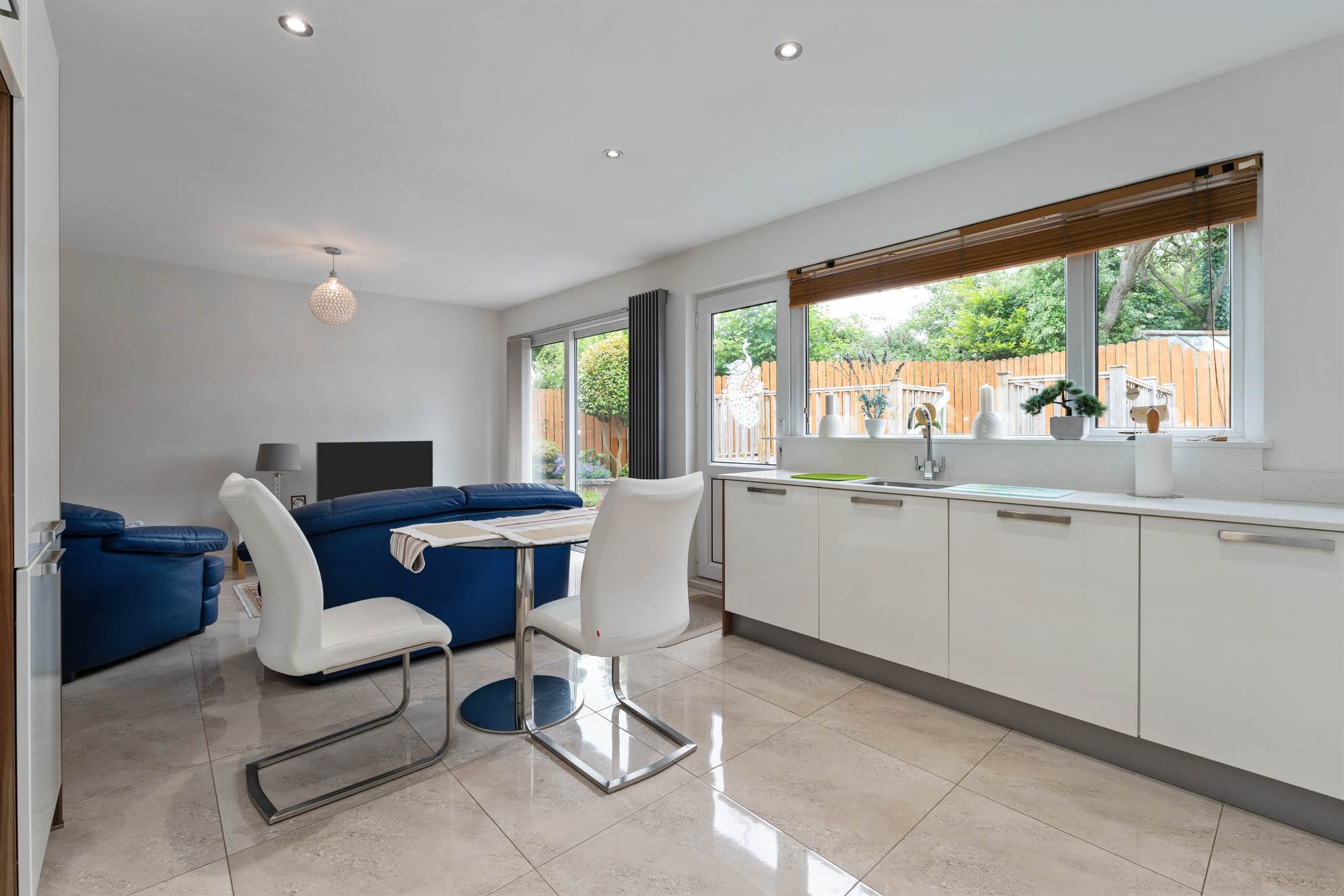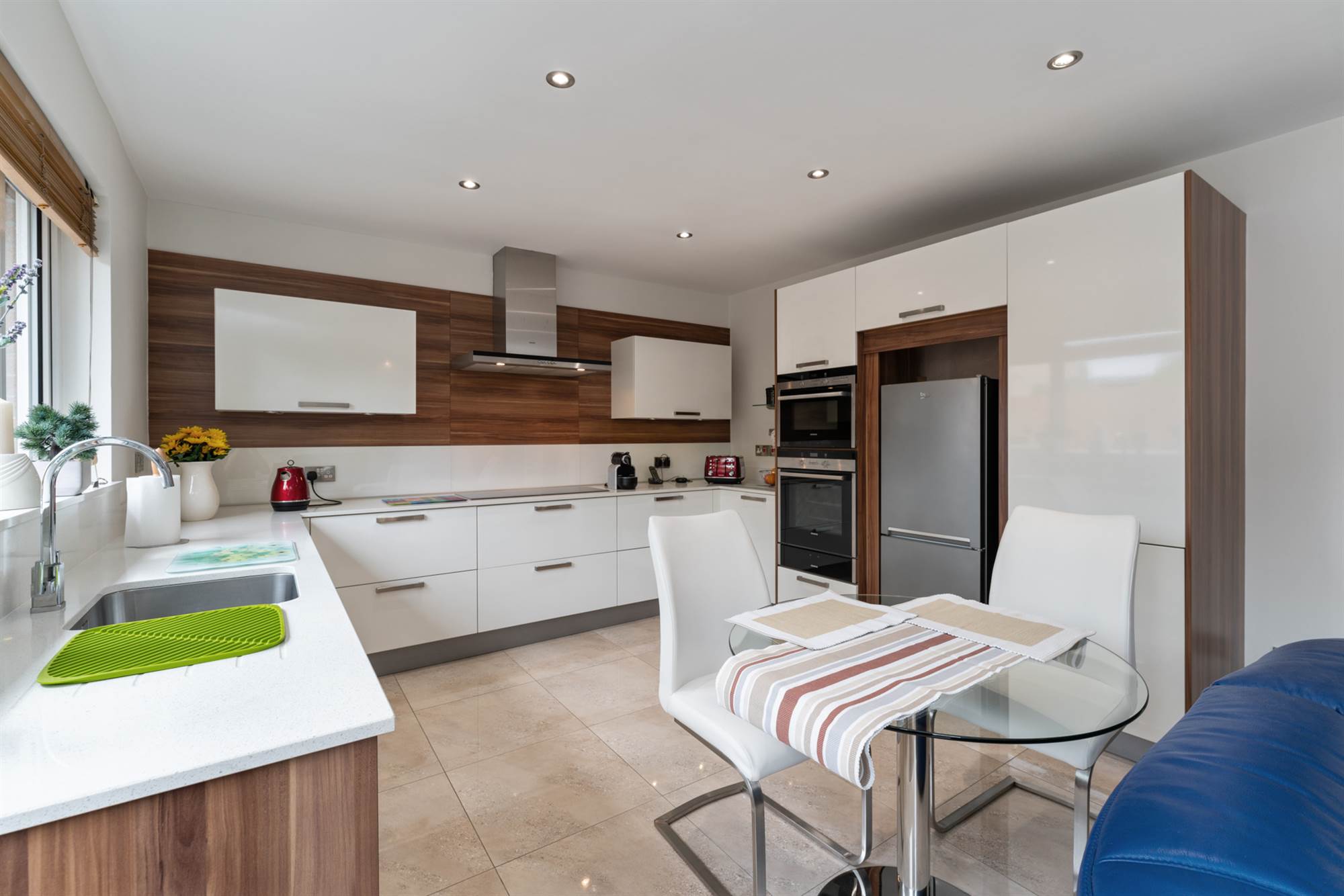 'Franke' single drainer stainless steel sink unit with mixer taps, excellent range of high and low level white high gloss units, granite work surfaces, 4 ring Siemens double induction hob unit, Siemens built in oven, Siemens warming drawer and Siemens microwave oven, pot drawers, 2 corner units, integrated Siemens dishwasher, stainless steel extractor hood, concealed LED lighting, 2 vertical radiators, ceramic tiled floor, LED recessed spotlighting, uPVC double glazed door and uPVC double glazed patio doors to rear garden.