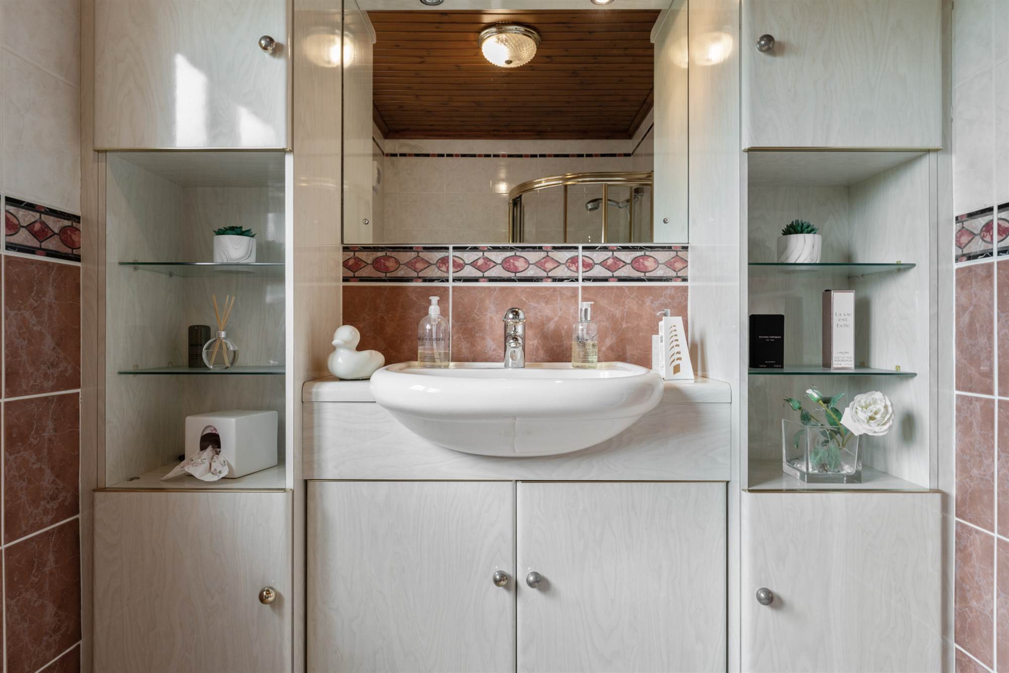 Contemporary white suite comprising: Separate fully tiled shower cubicle with thermostatically controlled shower, built in vanity unit with cupboards and shelving, wash hand basin with mixer taps, low flush WC, fully tiled walls, ceramic tiled floor, extractor fan.