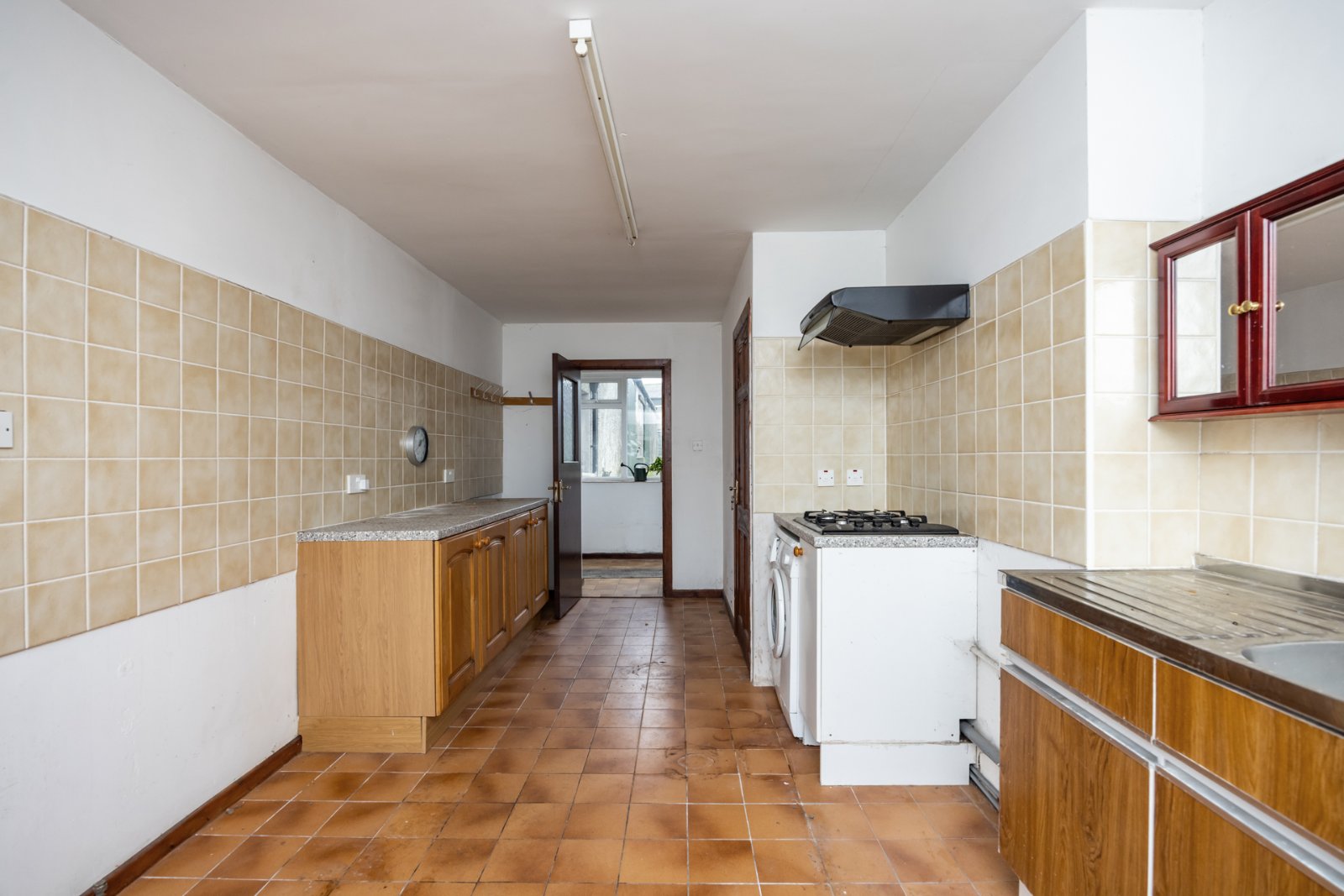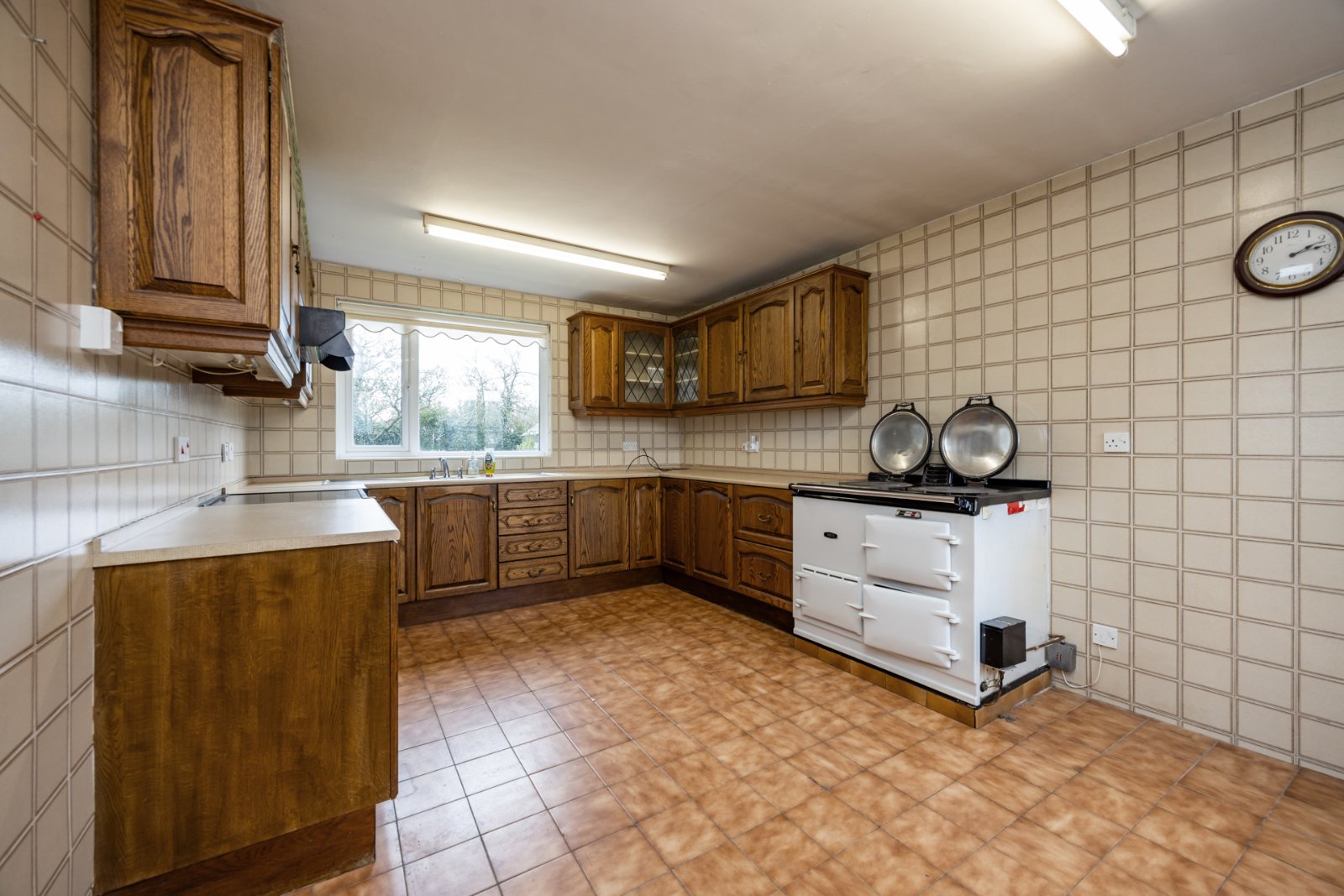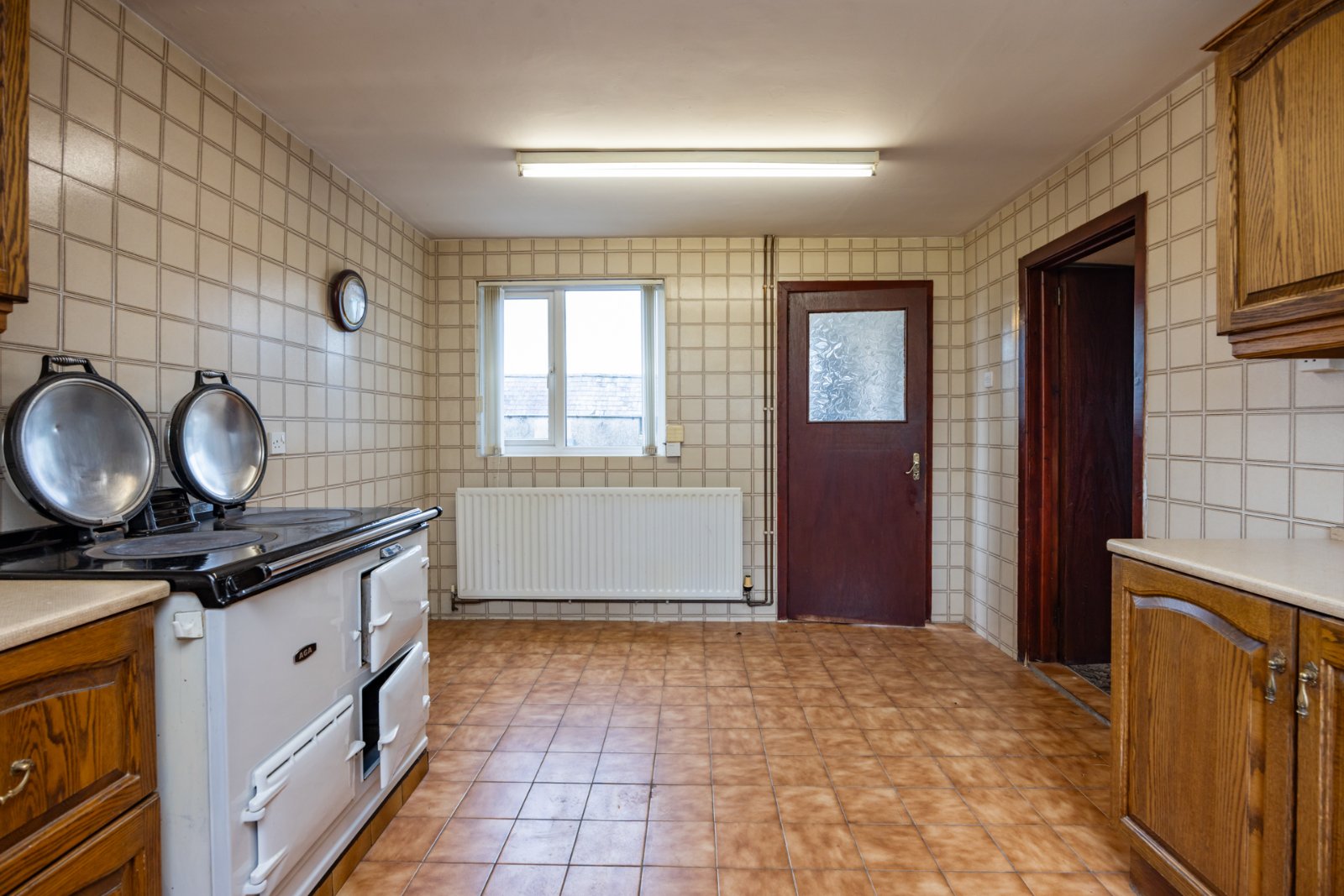Full range of high and low level oak units with glazed display cupboards, oil fired Aga, recess for cooker, partly tiled walls, ceramic tiled floor.