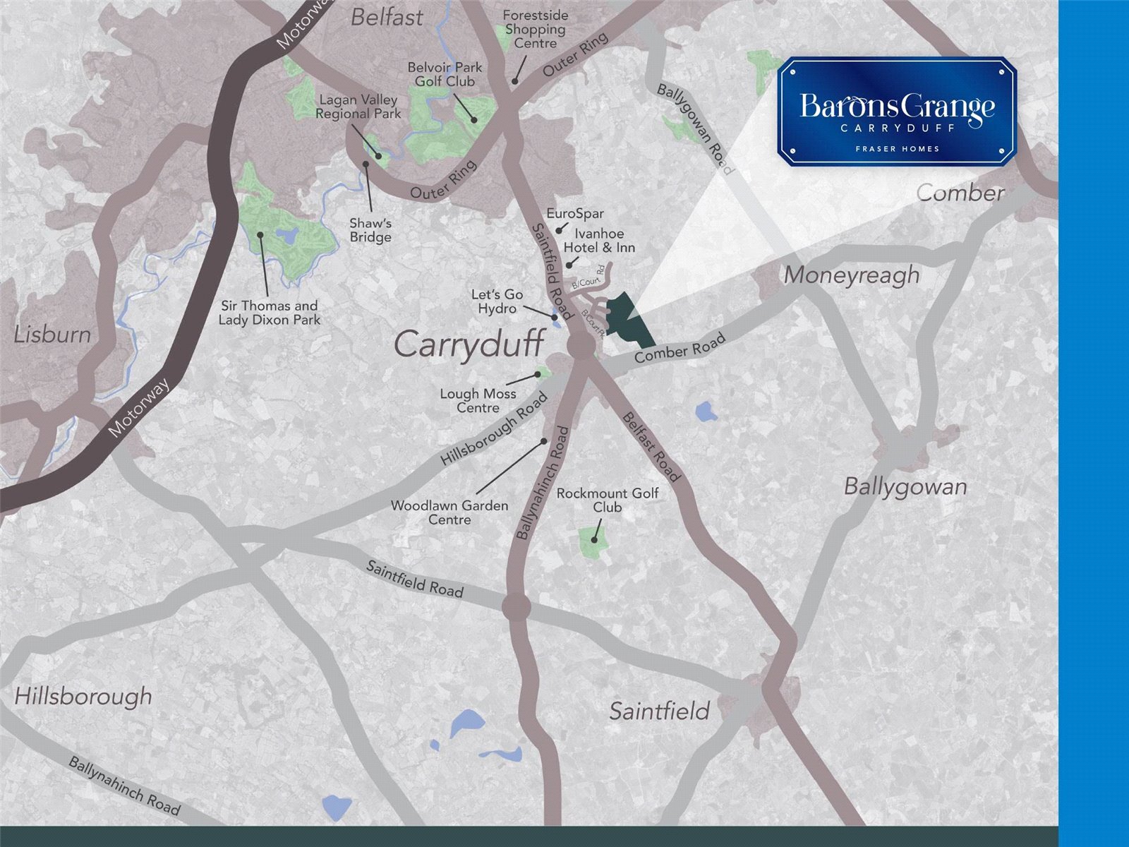 Located in the thriving community of Carryduff, BaronsGrange is ideally placed for today´s modern living. Just 6 miles south of Belfast city centre Carryduff is perfectly situated for commuting to Belfast. With the M1 at Lisburn just 8 miles away Carryduff also has easy access to the motorway network. Excellent transport links also include a regular bus service within walking distance of the development and the Cairnshill Park and Ride which is just two miles along the Saintfield Road towards Belfast.