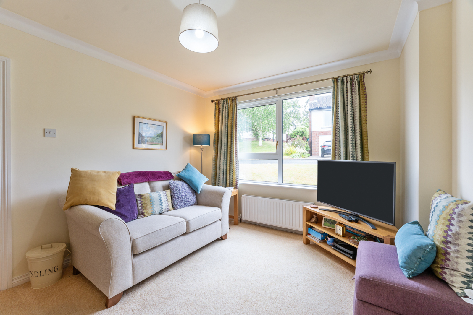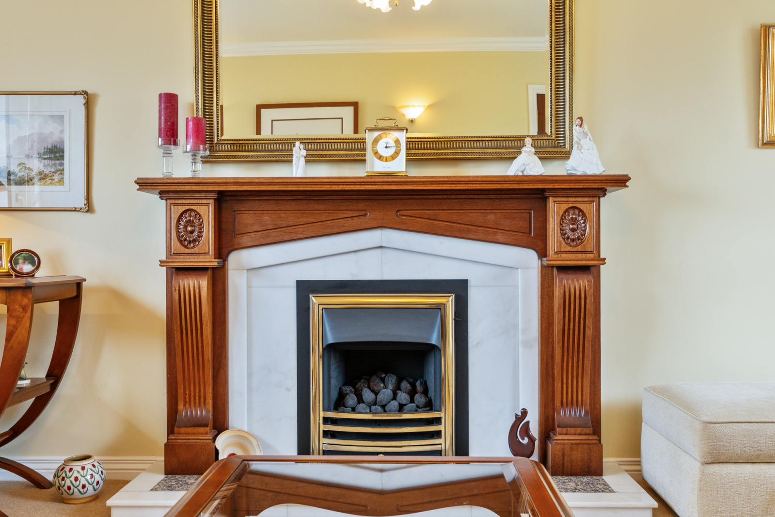 Attractive dark oak fireplace surround, marble inset, granite hearth, gas fire, dual aspect, wall light points, corniced ceiling, uPVC double glazed patio doors to rear enclosed garden.