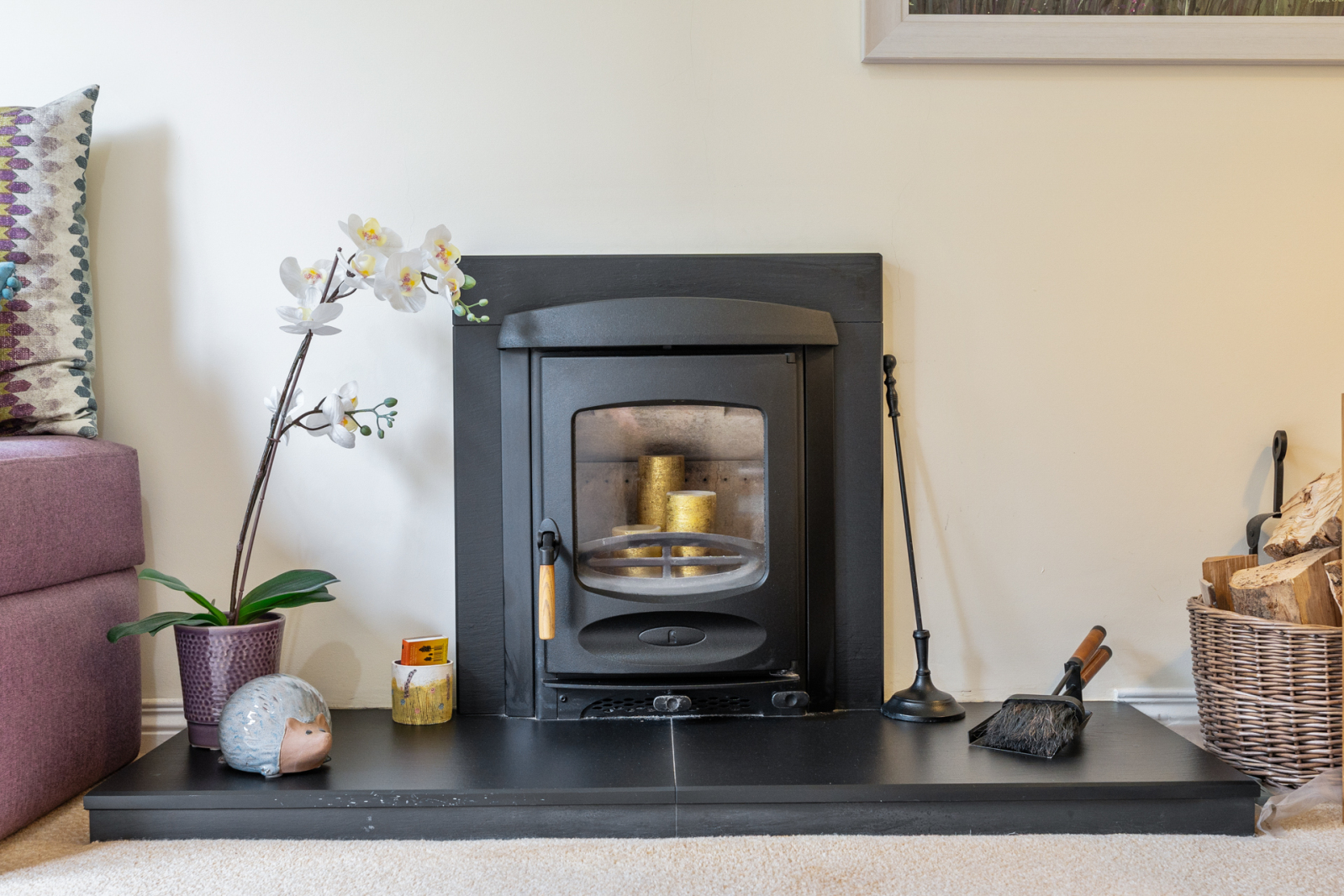 Attractive inset 'Charnwood' wood burning stove, slate hearth, corniced ceiling.