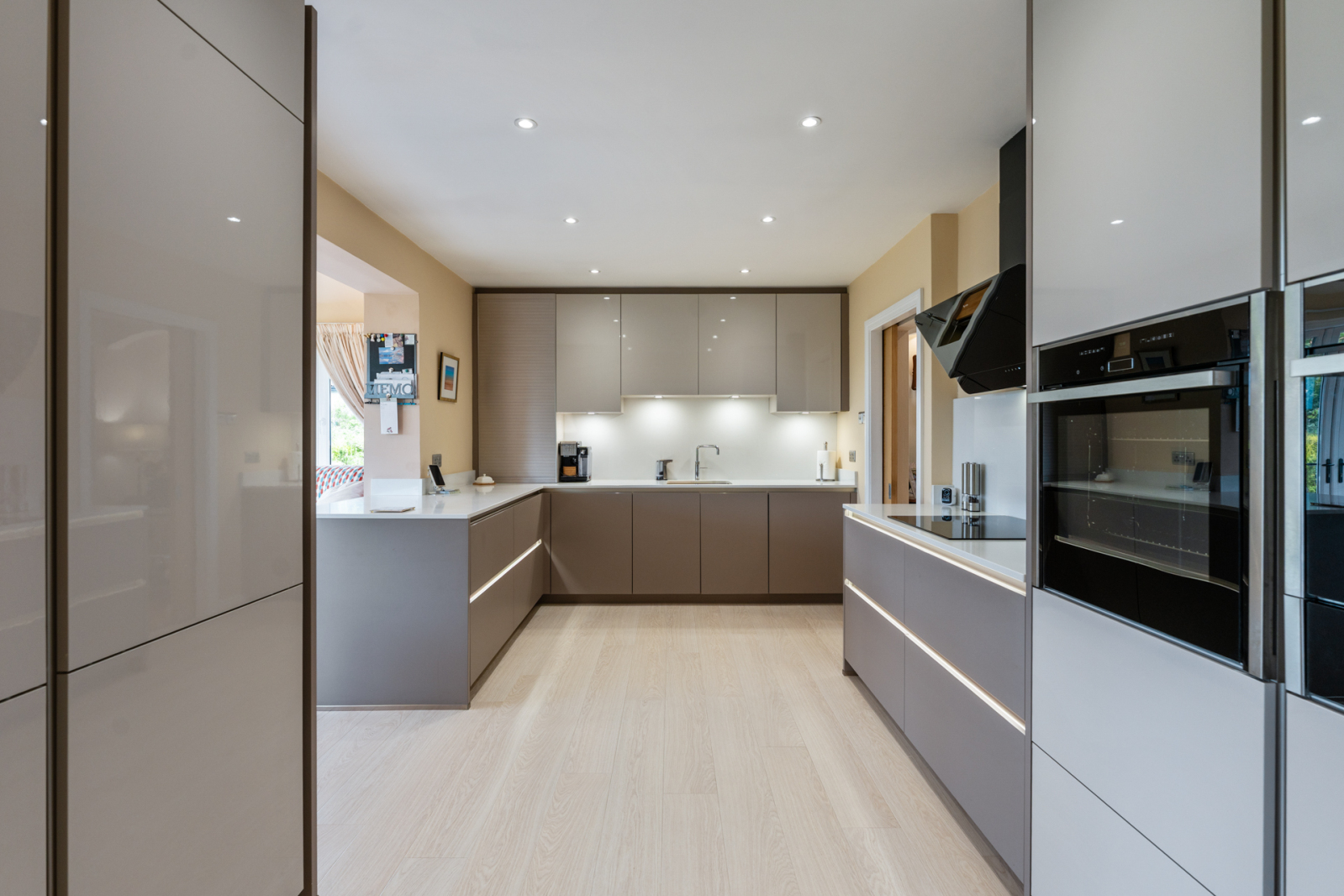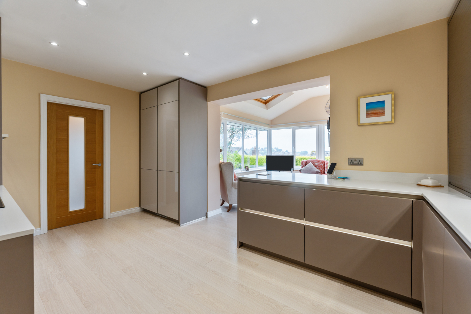 Recessed stainless steel sink unit with Quooker tap, excellent range of Truffle Grey and Cashmere high gloss units, Quartz worktops, 4 ring induction hob, built in oven, combination oven, warming drawer (all Neff), black gloss extractor hood, integrated Neff dishwasher, LED feature lighting, shutter cupboard, LED recessed spotlighting, wood effect polished laminate floor, open to Sun Room.