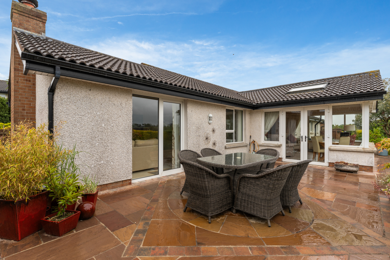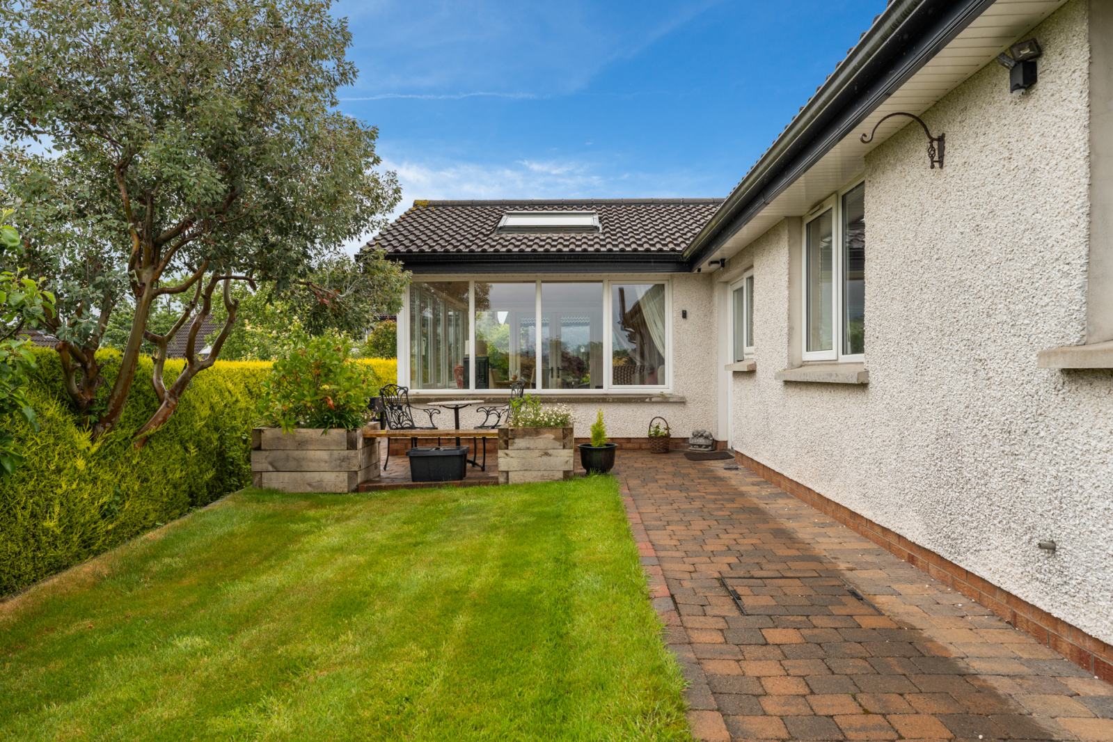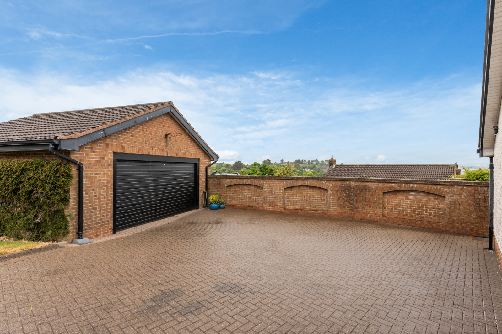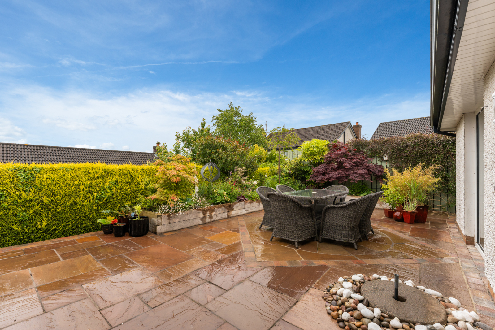 Externally the property rests on a wide and easily managed plot with manicured lawns, feature Sandstone patio, mature trees, hedging and shrub beds. There is also a detached double garage which is approached via a spacious Tobermore paved driveway and offers excellent off-road parking for family and guests.