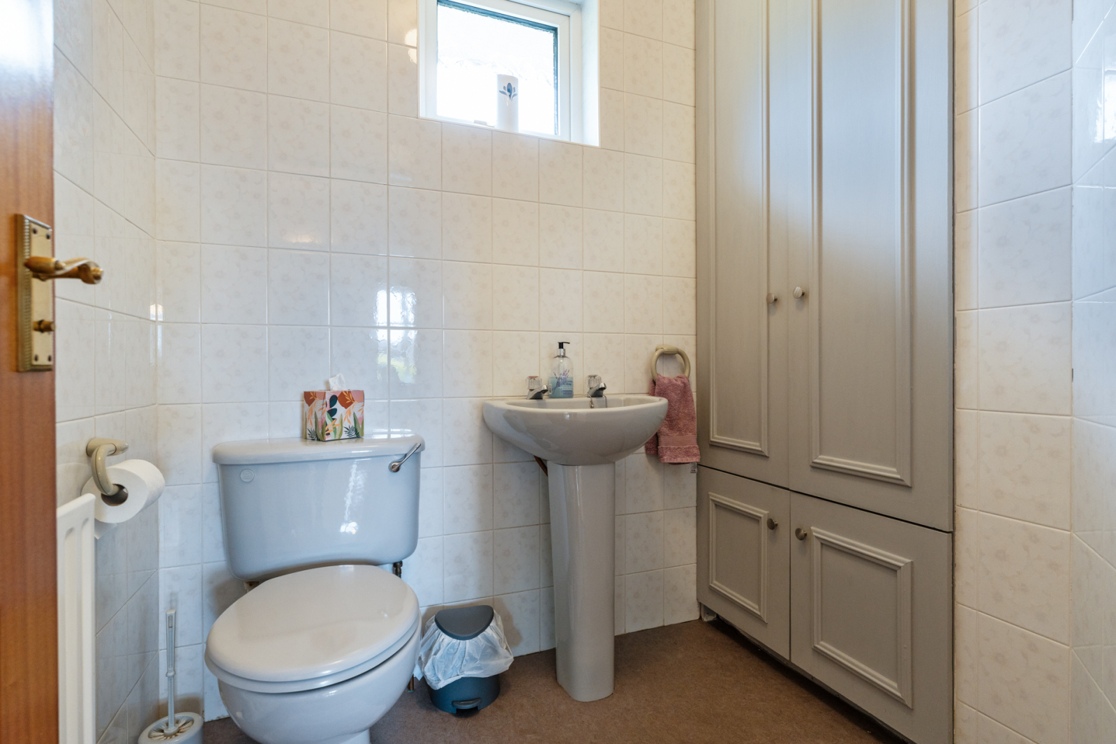 Modern white suite comprising: Large separate fully tiled shower cubicle, Mira Sport thermostatically controlled shower, glass panel, pedestal wash hand basin with mixer taps, push button WC, large towel radiator, wired for wall mounted mirror, recessed spotlighting, extractor fan.