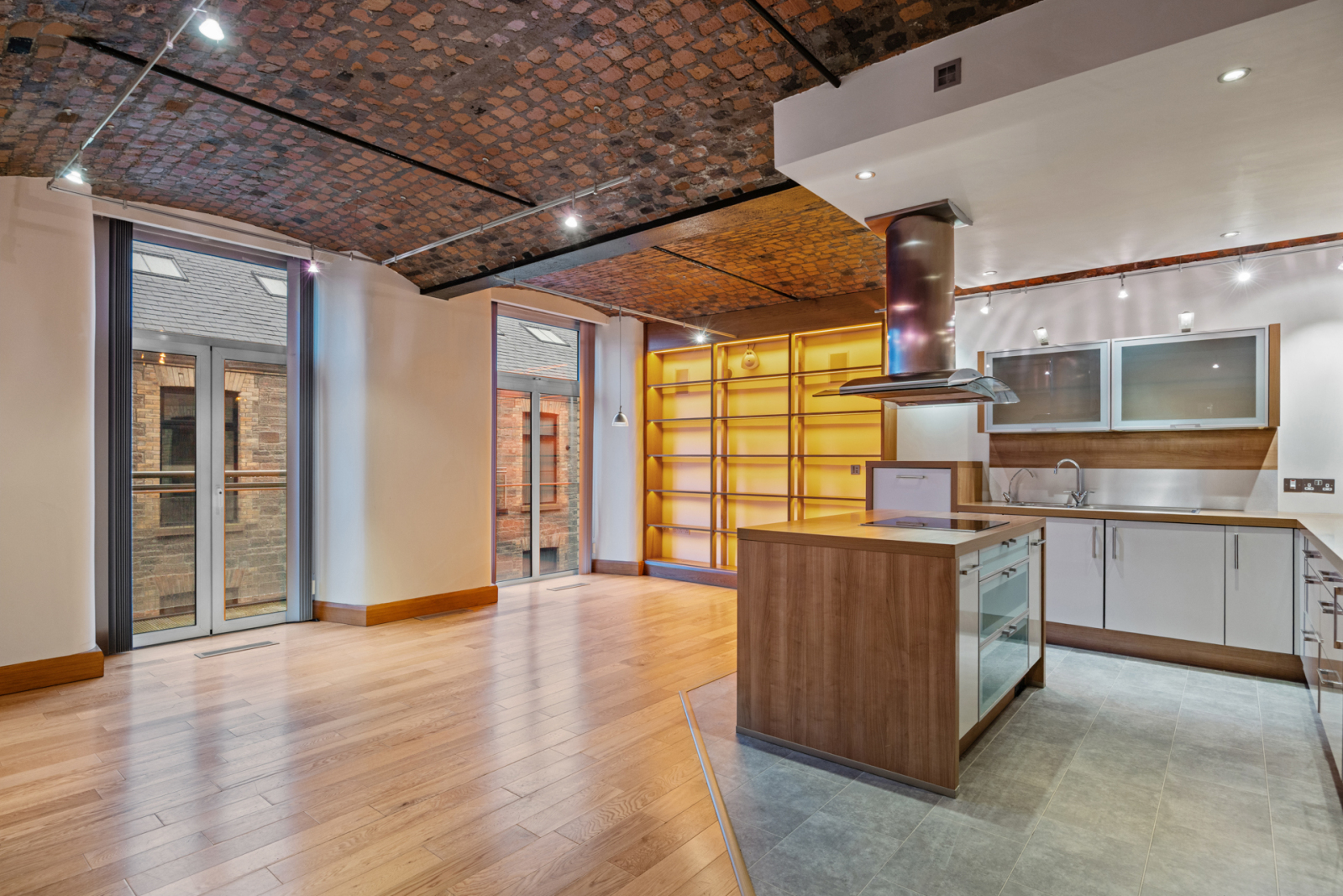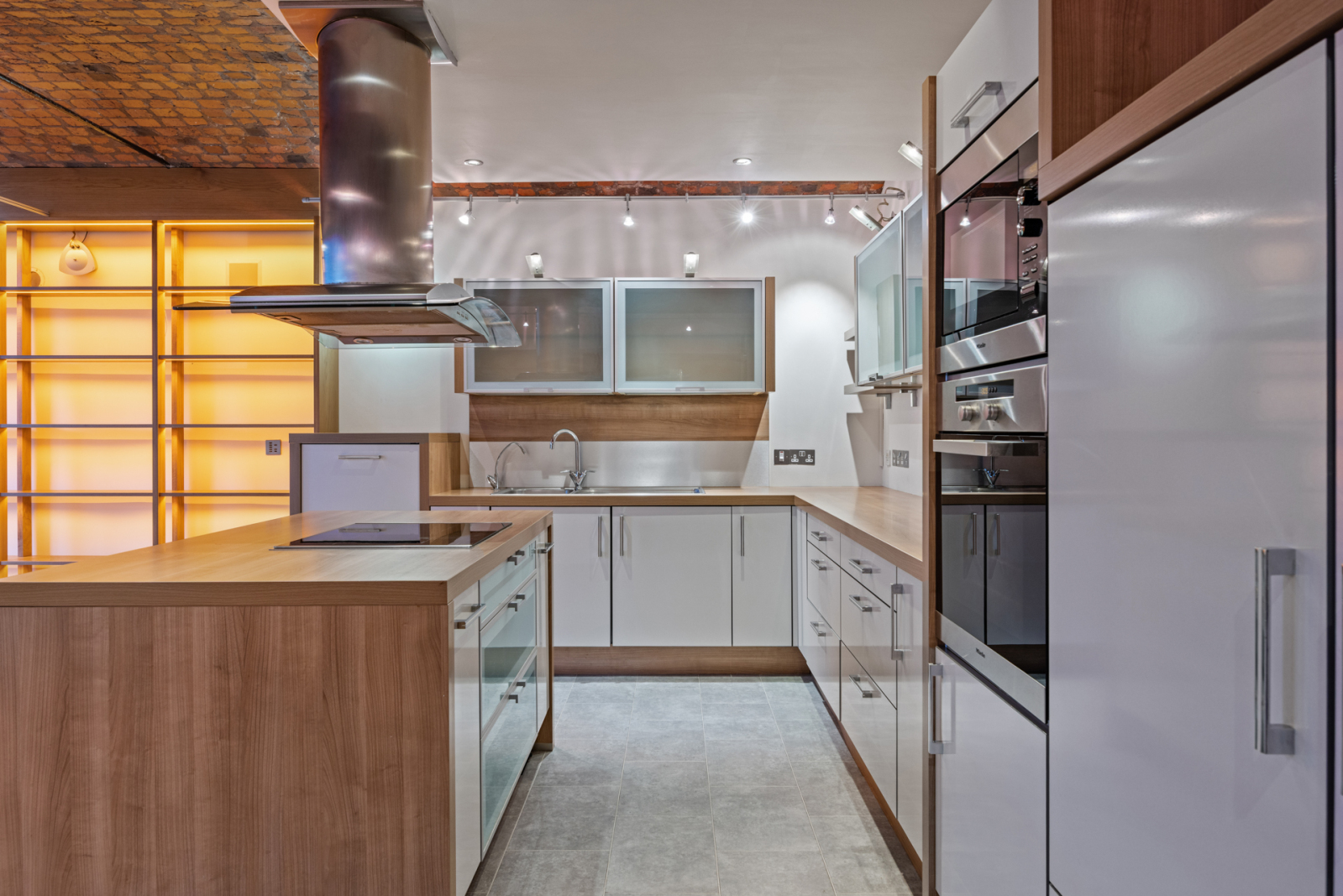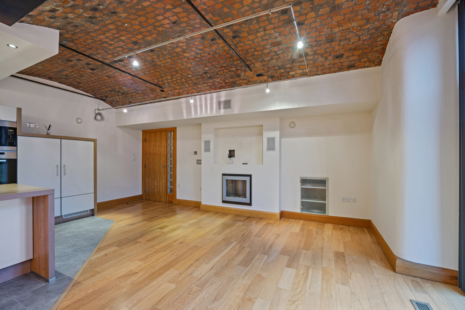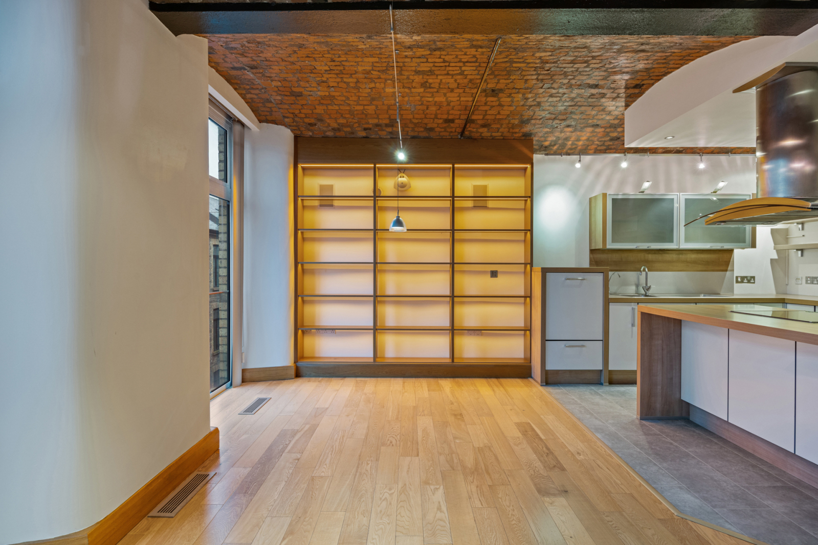 1.5 tub single drainer stainless steel sink unit with mixer taps, filtered water tap, excellent range of high and low level cream high gloss modern units, wood effect work surfaces, built in Miele oven and microwave, integrated Siemens Fridge, Neff Freezer and Miele dishwasher, cantelever glazed units with mood lighting above, Island in matching units and tops, Sharp induction hob and stainless steel and Miele glass extractor hood, larder cupboards, power socket and breakfast bar, tile effect polished laminate floor to Kitchen area, polished oak floor to Dining/Living space, wall mounted inset electric fire, wired for wall mounted TV, built in surround sound wall speakers, recess for media equipment, feature red brick barrel ceiling, custom designed built in oak display/bookcase with integrated LED lighting, two floor to ceiling windows, double glazed French doors to balcony.
