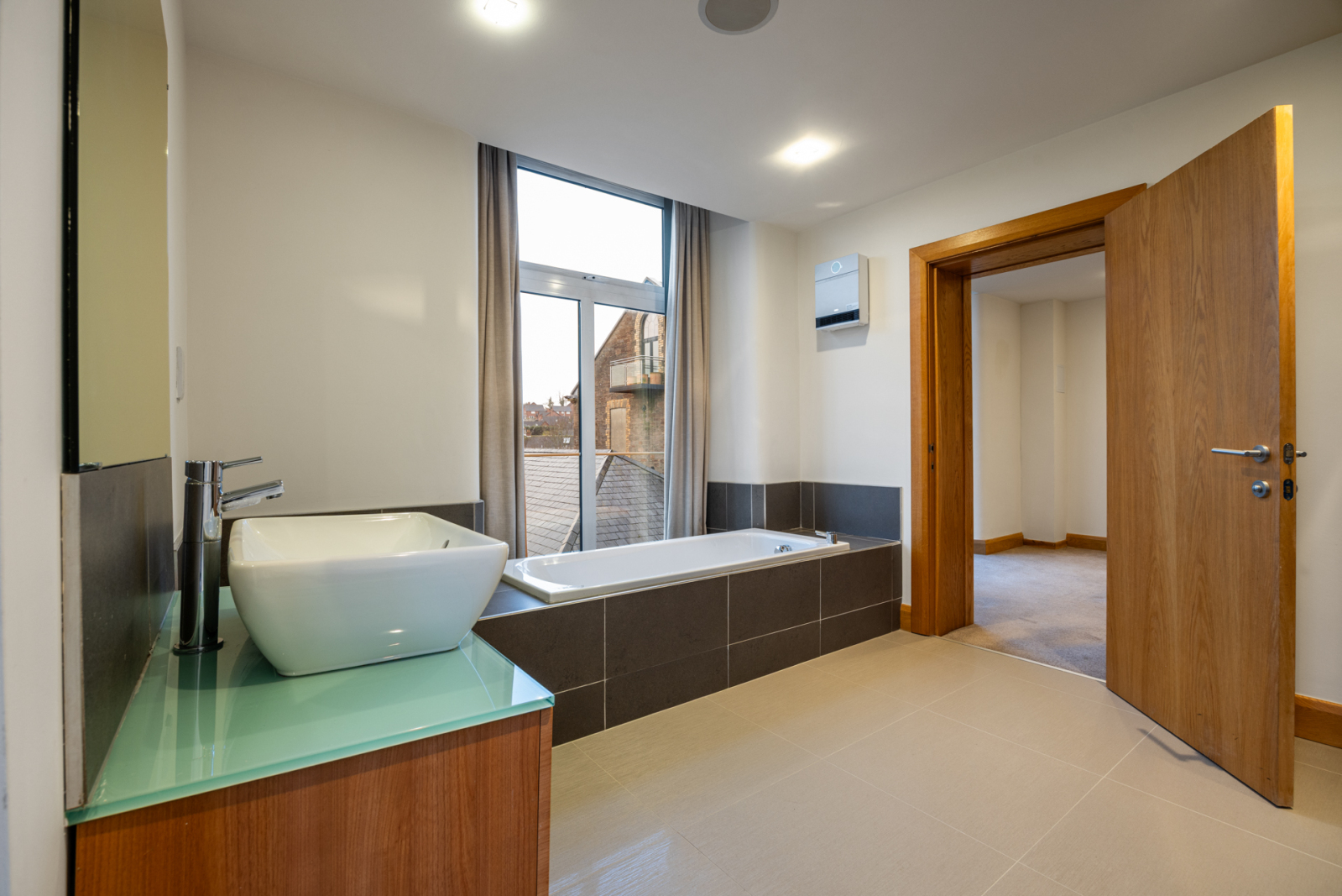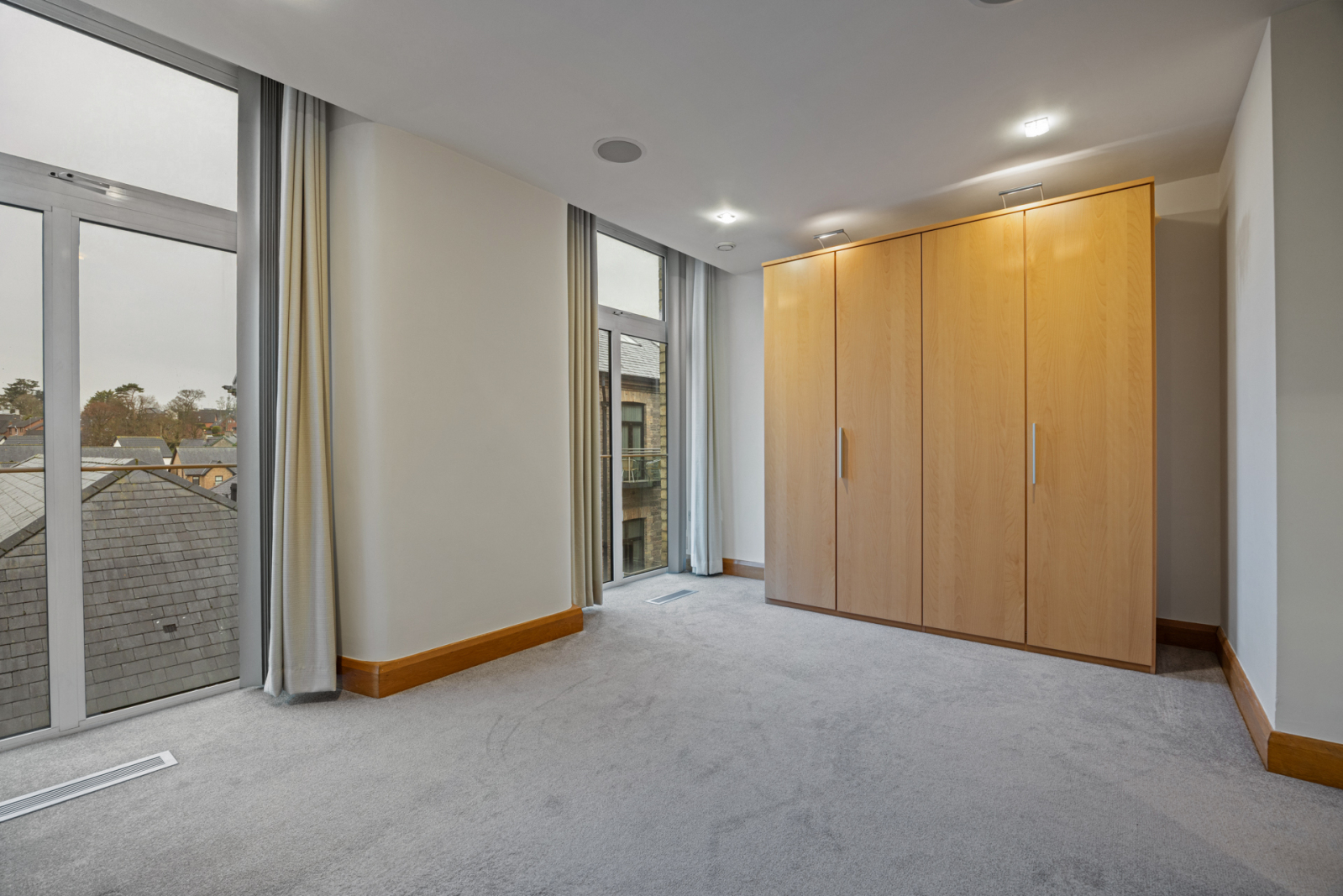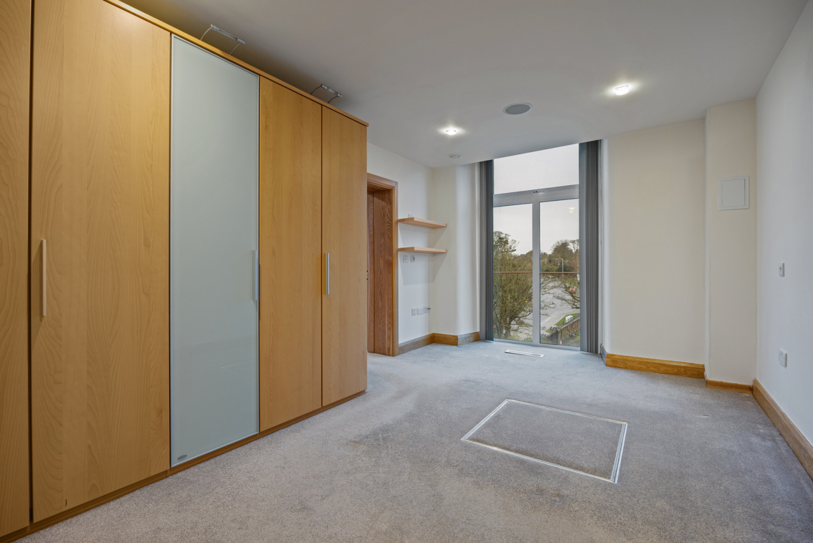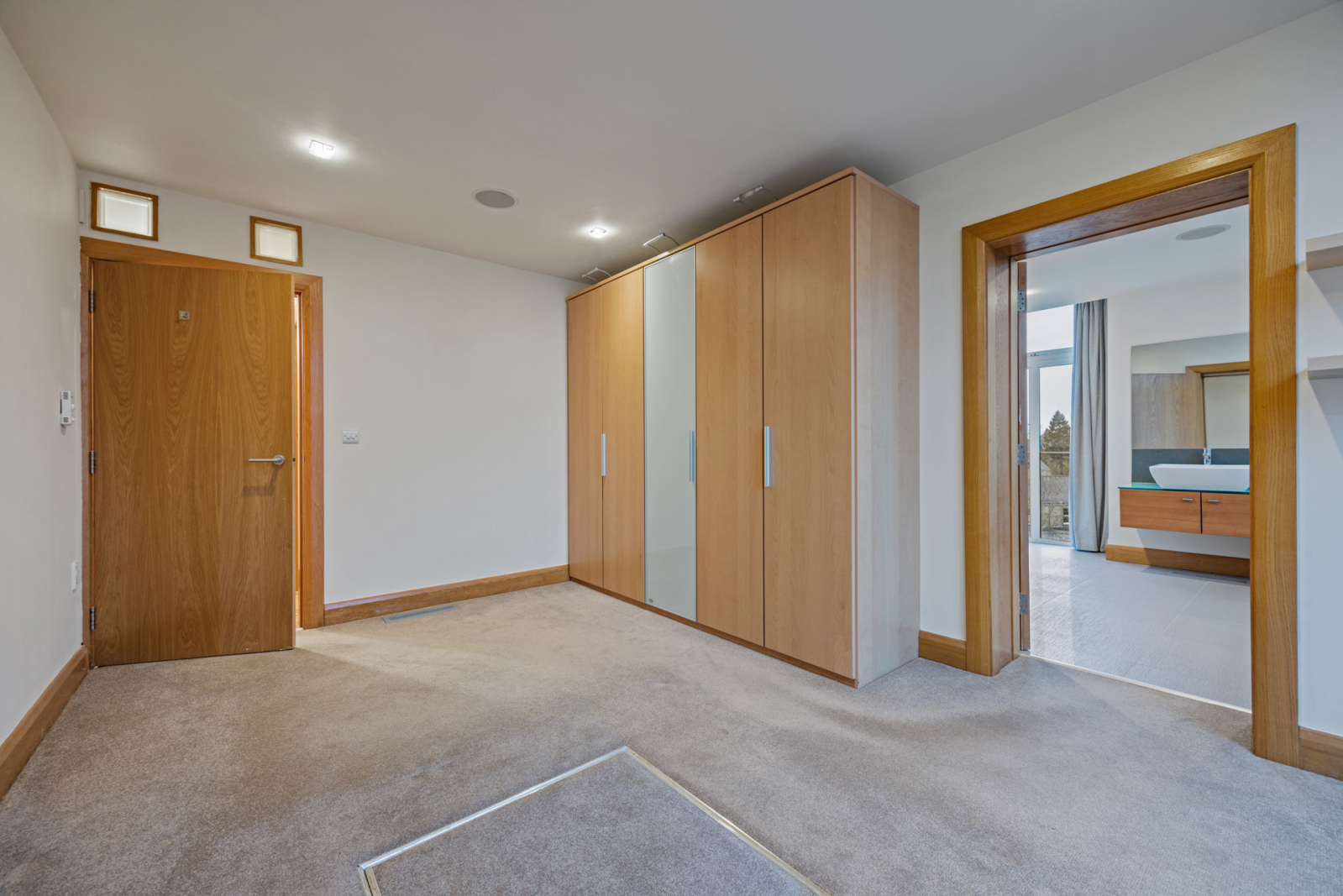 Excellent range of modern built in robes with lighting, concealed Worcester gas boiler, ceiling speakers, recessed spotlighting, two floor to ceiling windows.