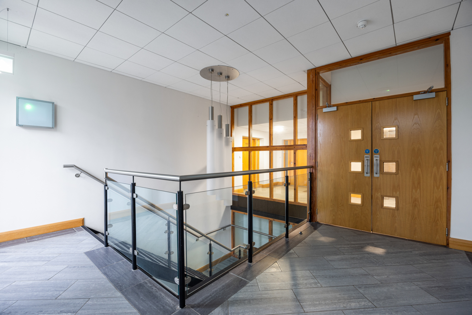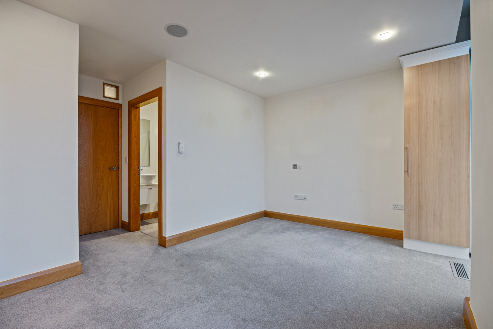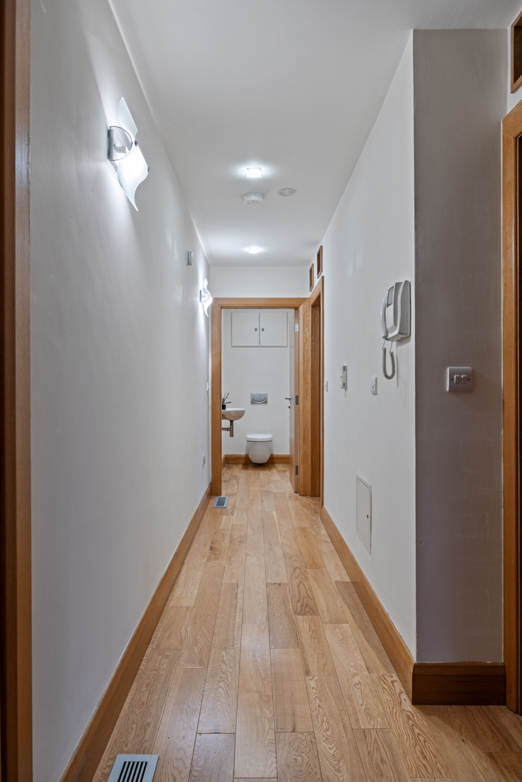 Polished oak floor, recessed coconut mat, recessed spotlighting, wall light points, intercom system, concealed linen cupboard