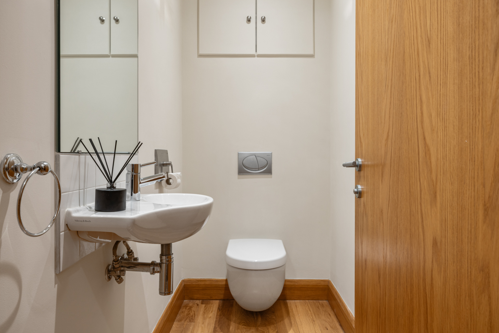 White Villeroy and Boch suite comprising: wall mounted wash hand basin with mixer taps, push button WC (concealed cistern) polished oak floor, recessed spotlighting, extractor fan.