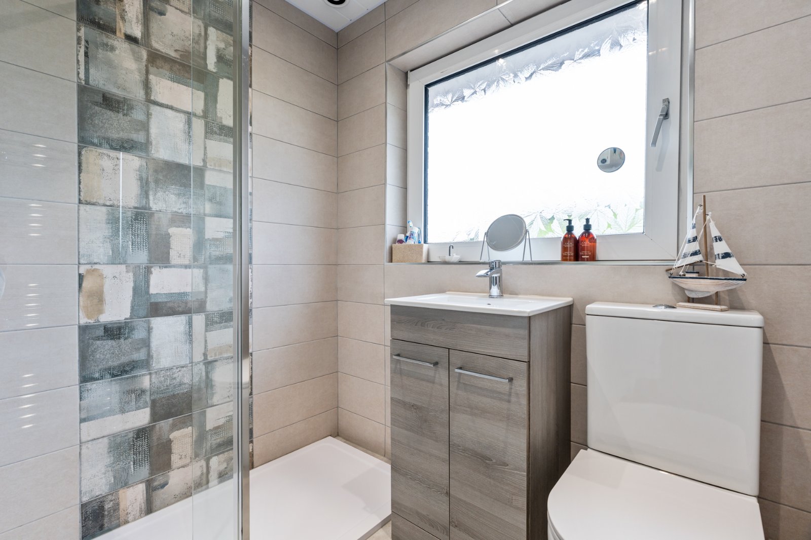 White suite comprising of low flush WC, wash hand basin with mixer tap, storage below, walkin mirror decor shower area, rainfall shower head and handset, fully tiled walls, tiled walls, chrome heated towel rail, recessed spot lighting.