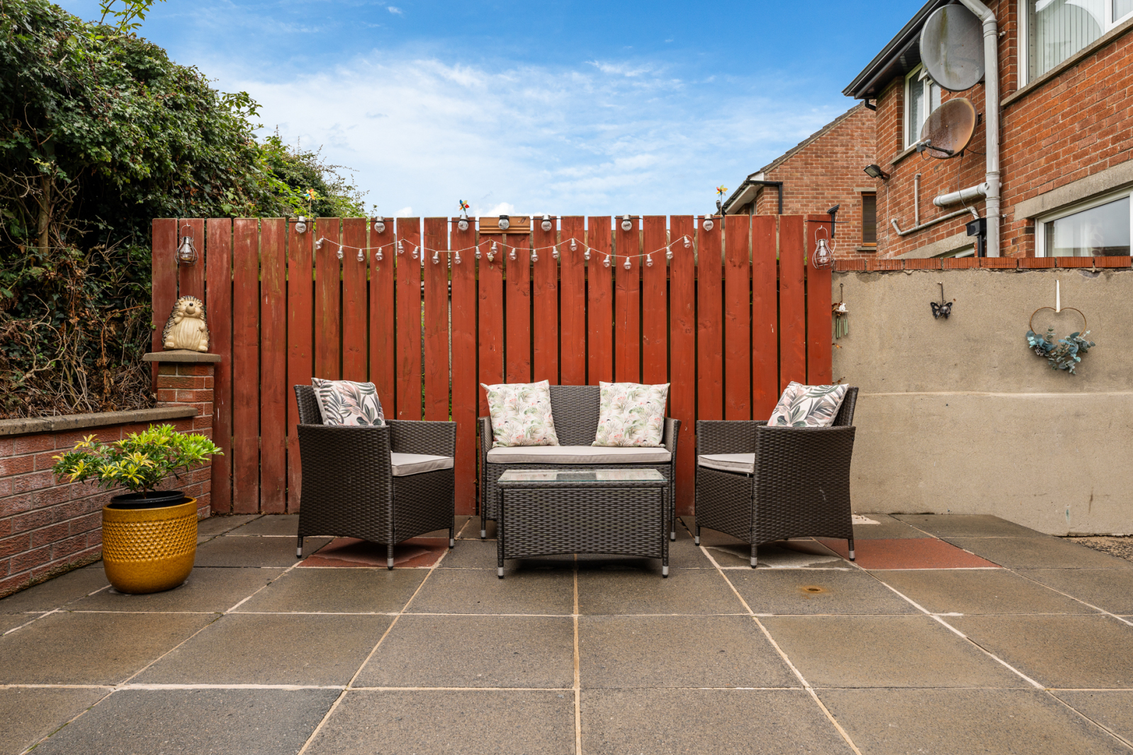 Ample driveway for off street car parking, loose stone pebbled area. South facing rear garden laid and paved patio area, ideal for outdoor entertaining, mature hedging.