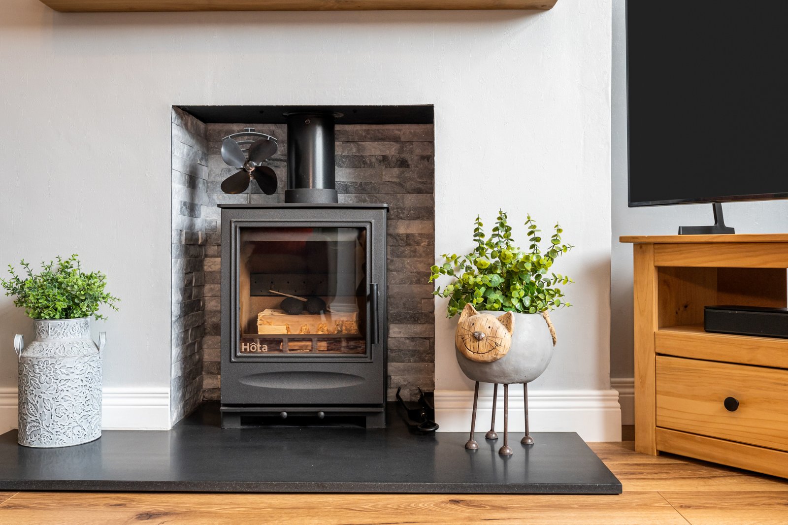 Hole in the wall fireplace with multi fuel burning stove, tiled inset and slate hearth, laminate wood effect flooring, outlook to front.