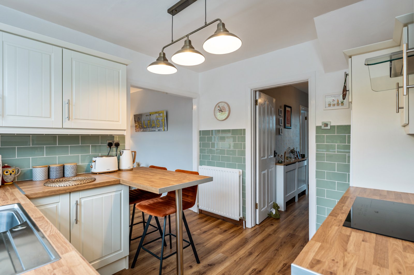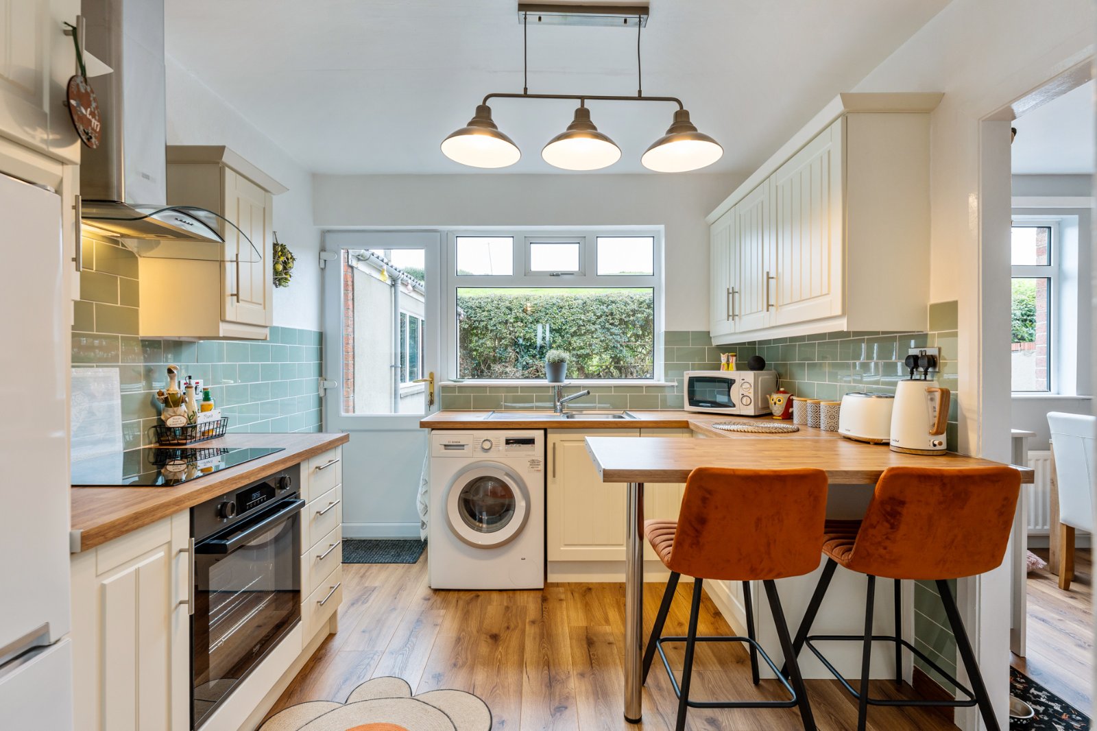 Fantastic range of high and low level units, laminate work surfaces with stainless steel sink unit and drainer, 1 tub with mixer tap, integrated becko oven, four ring induction hob above, glass stainless steel extractor fan, space for fridge freezer, plumbed for washing machine, breakfast bar for casual dining, laminate wood effect flooring, tiled walls, access door to rear garden, open to living / dining area.