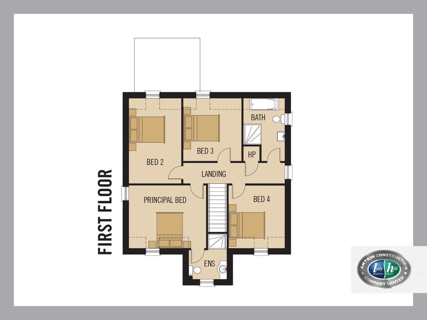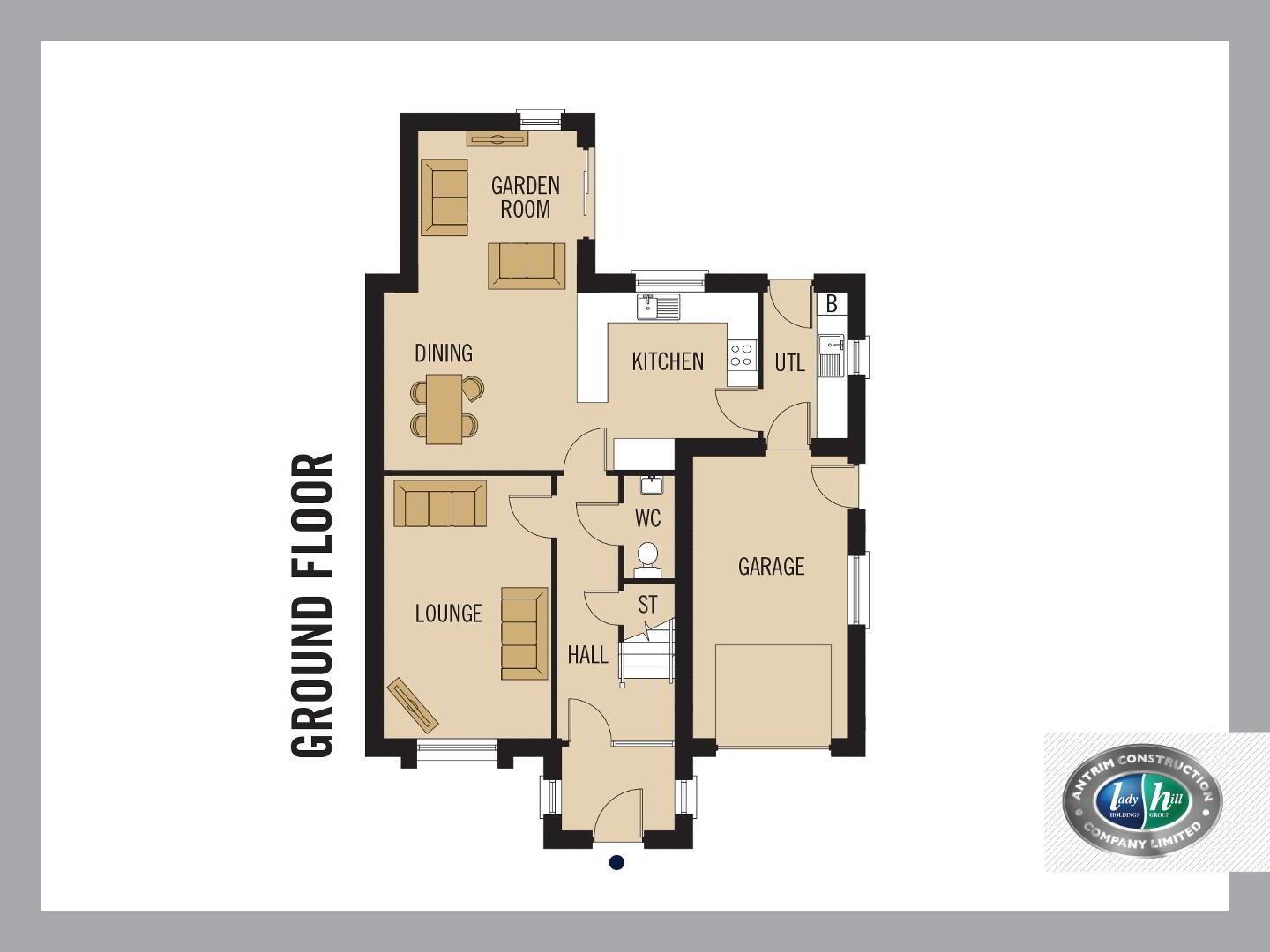 Walls are of traditional, tried and tested cavity construction. Brick and/or plaster render are used for the external finish. External timber features are painted to match where applicable. The roof will have a grey coloured, flat concrete tile crowned by a dry fixed ridge tile. uPVC round guttering with round uPVC downpipes compliment the external trim.