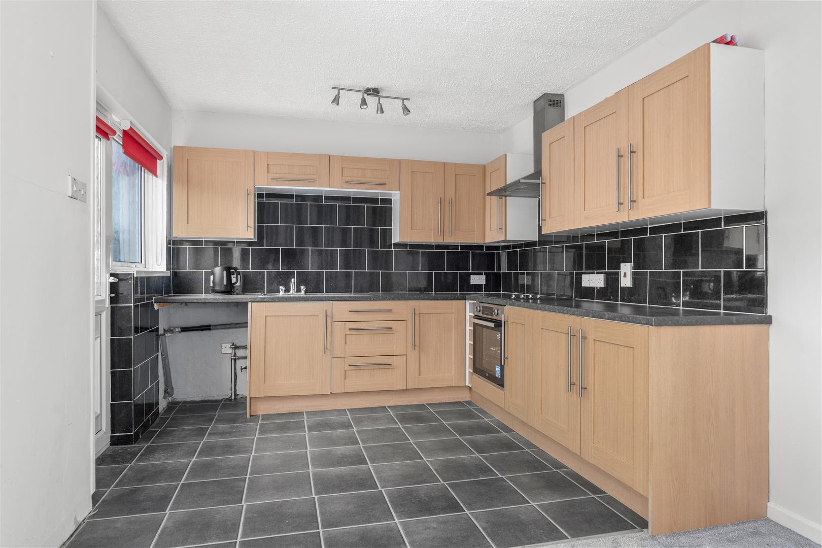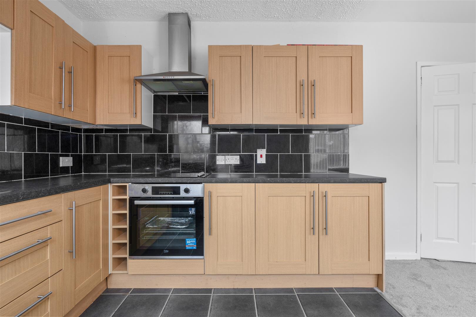 Modern light oak high and low level cupboards and drawers incorporating single drainer stainless steel sink unit with mixer tap; 'Beko' electric under oven with electric four ring hob; modern brushed steel extractor hood over; part ceramic tiled walls; formica worktops; wine rack; part laminate tile effect flooring; Pvc double glazed door to rear; under stair storage / cloakroom.