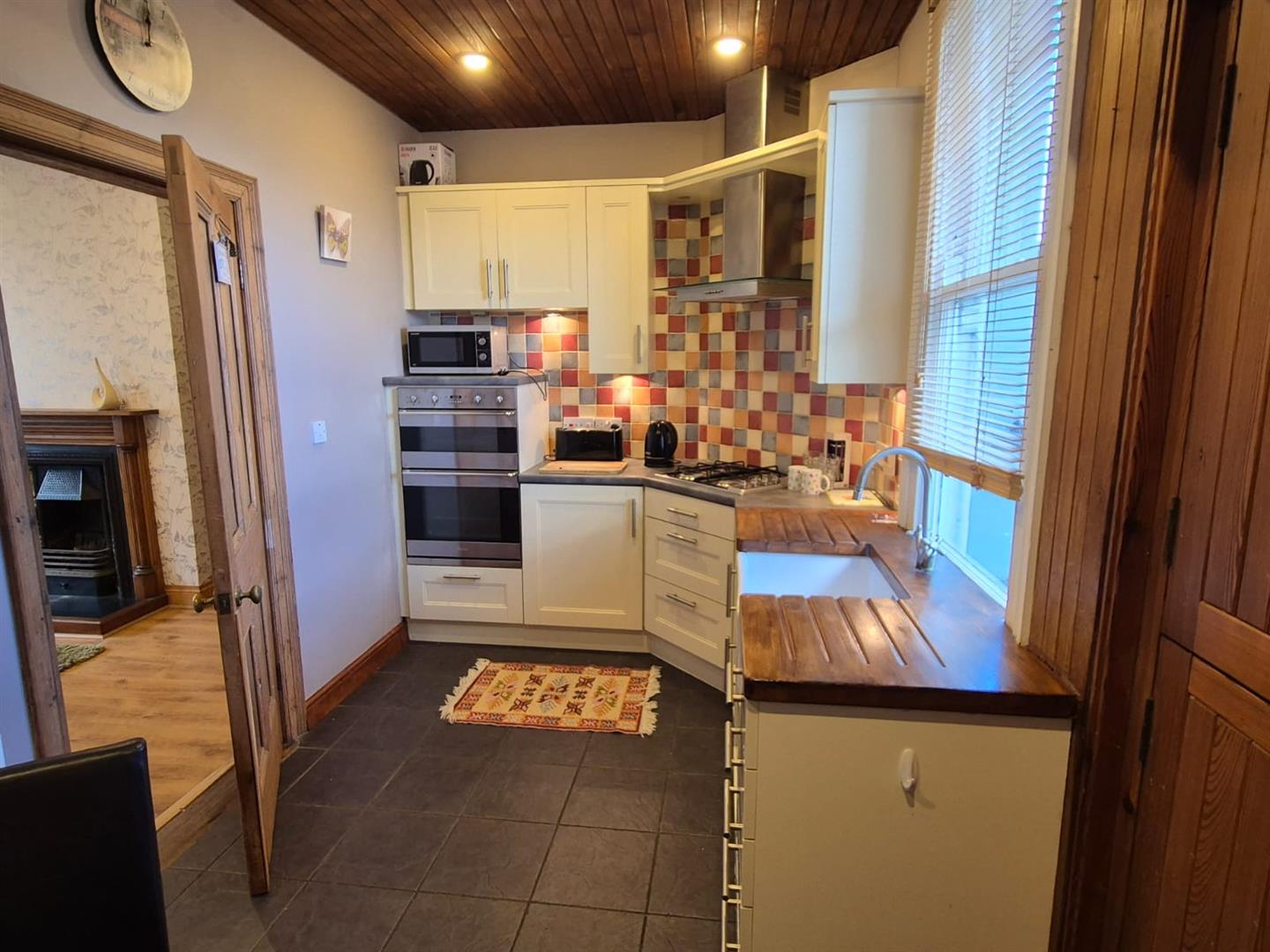 Good range of modern wood laminate high and low level cupboards and drawers incorporating glazed Belfast sink with mixer tap; integrated Smeg electric double oven and grill; Smeg four ring gas hob; extractor hood over; integrated fridge; formica worktop and wooden worktop; tiled splashback; tiled floor; tongue and groove ceiling; pine stable door to rear;
