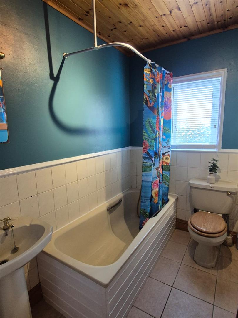 Cream coloured suite comprising panelled bath with brass effect mixer tap and telephone shower attachment; low flush wc; pedestal wash hand basin; part tiled walls; tiled floor; built-in storage cupboard; towel radiator;