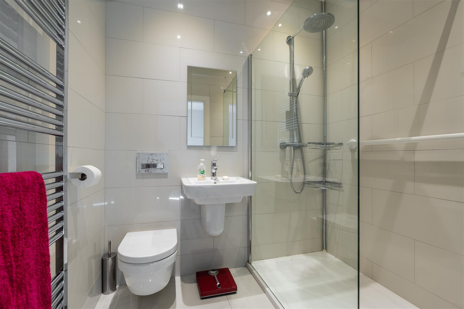 Modern white suite comprising walk-in shower with thermostatically controlled shower unit; wall mounted telephone shower attachment and drench head over; glass shower screen; semi pedestal wash hand basin with mono mixer tap; wall mounted wc with concealed cistern; chrome towel radiator; recessed spotlighting; tiled walls and floor; extractor fan.