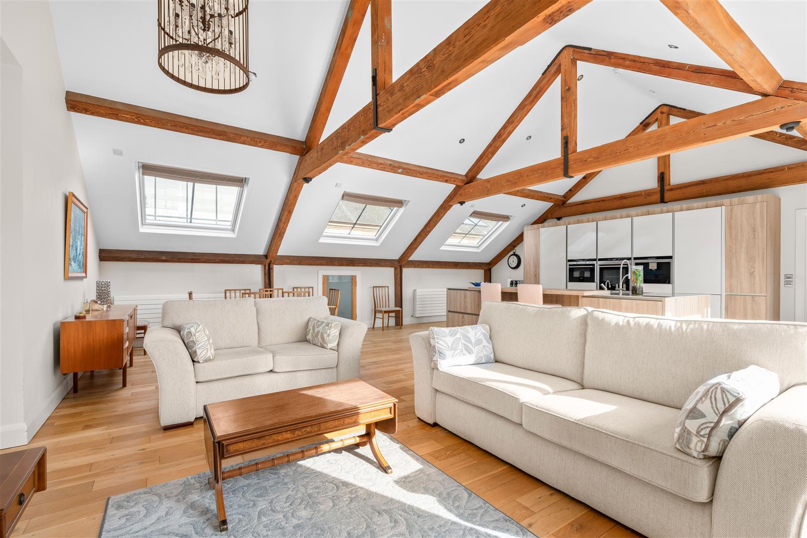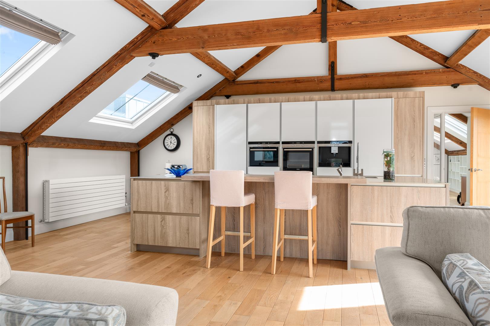Excellent range of contemporary high and low level cupboards and drawers with matching island unit incorporating Franke single drainer sink unit with swan neck mixer taps; Quooker tap; Siemens electric oven; Siemens coffee machine; CDA fridge / freezer; Siemens 4 ring ceramic hob; Siemens combi microwave oven; Best retractable extractor unit; CDA dishwasher; quartz worktops with raised oak breakfast bar; exposed ceiling beams; wood strip floor; recessed spotlighting; sliding doors onto decked balcony areas; access to eaves storage.