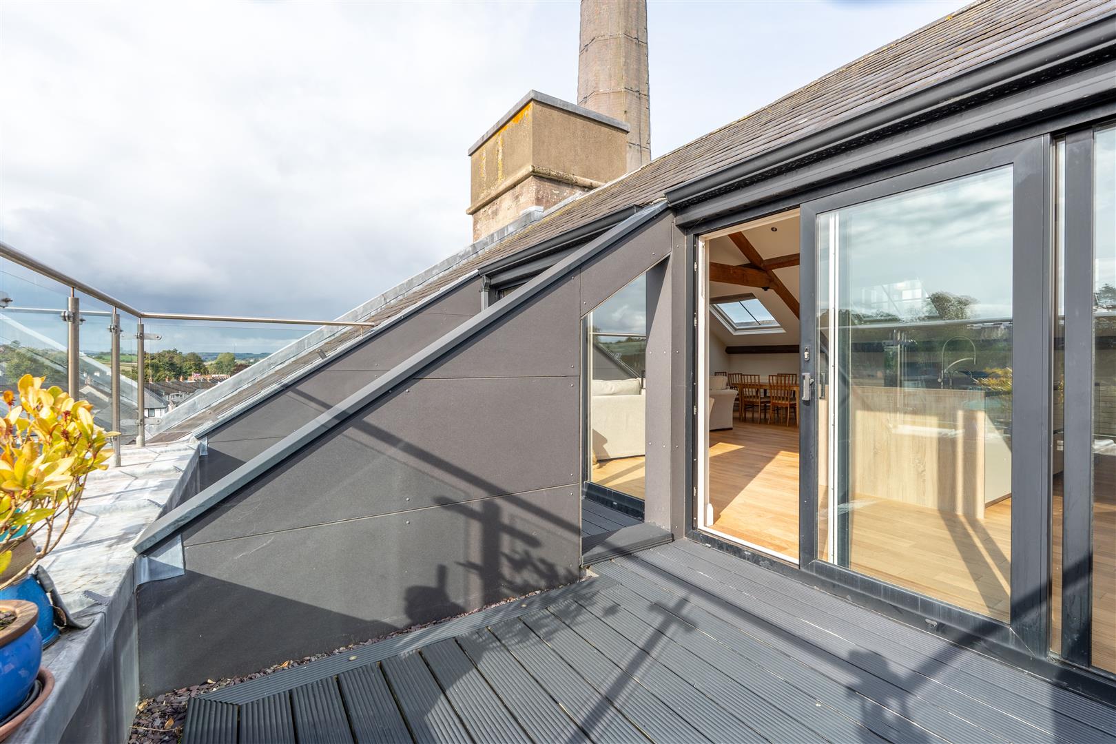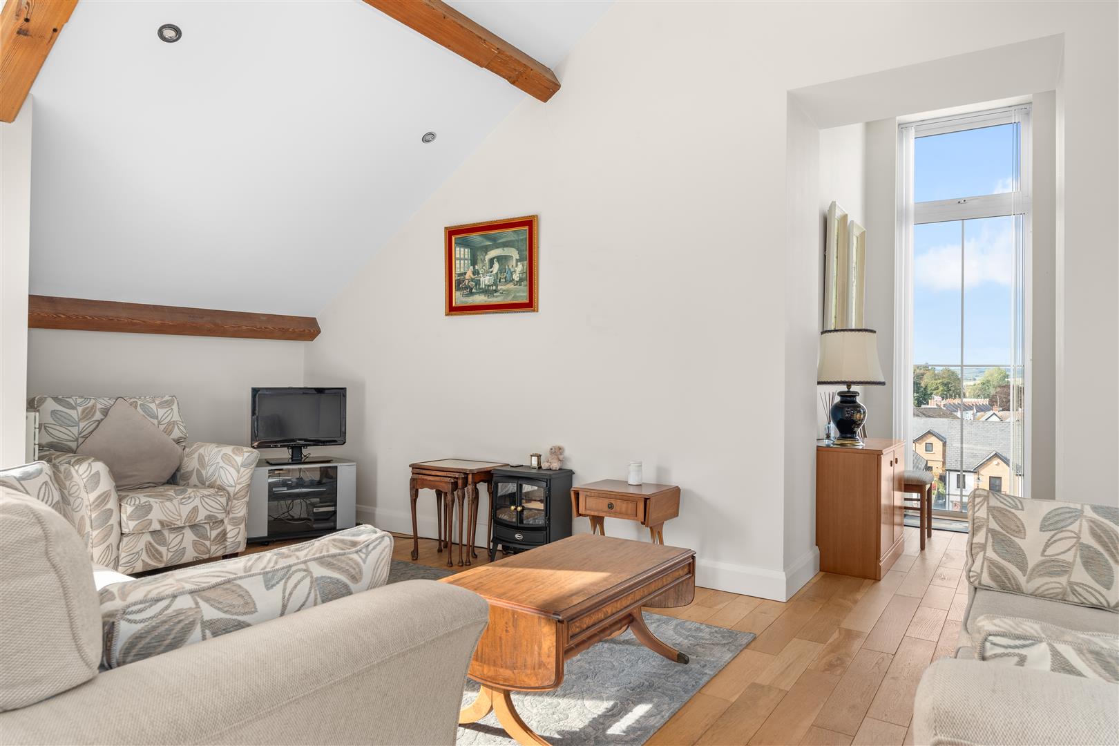 Built-in wardrobes; exposed ceiling beams; recessed spotlighting; sliding door to decked balcony.
