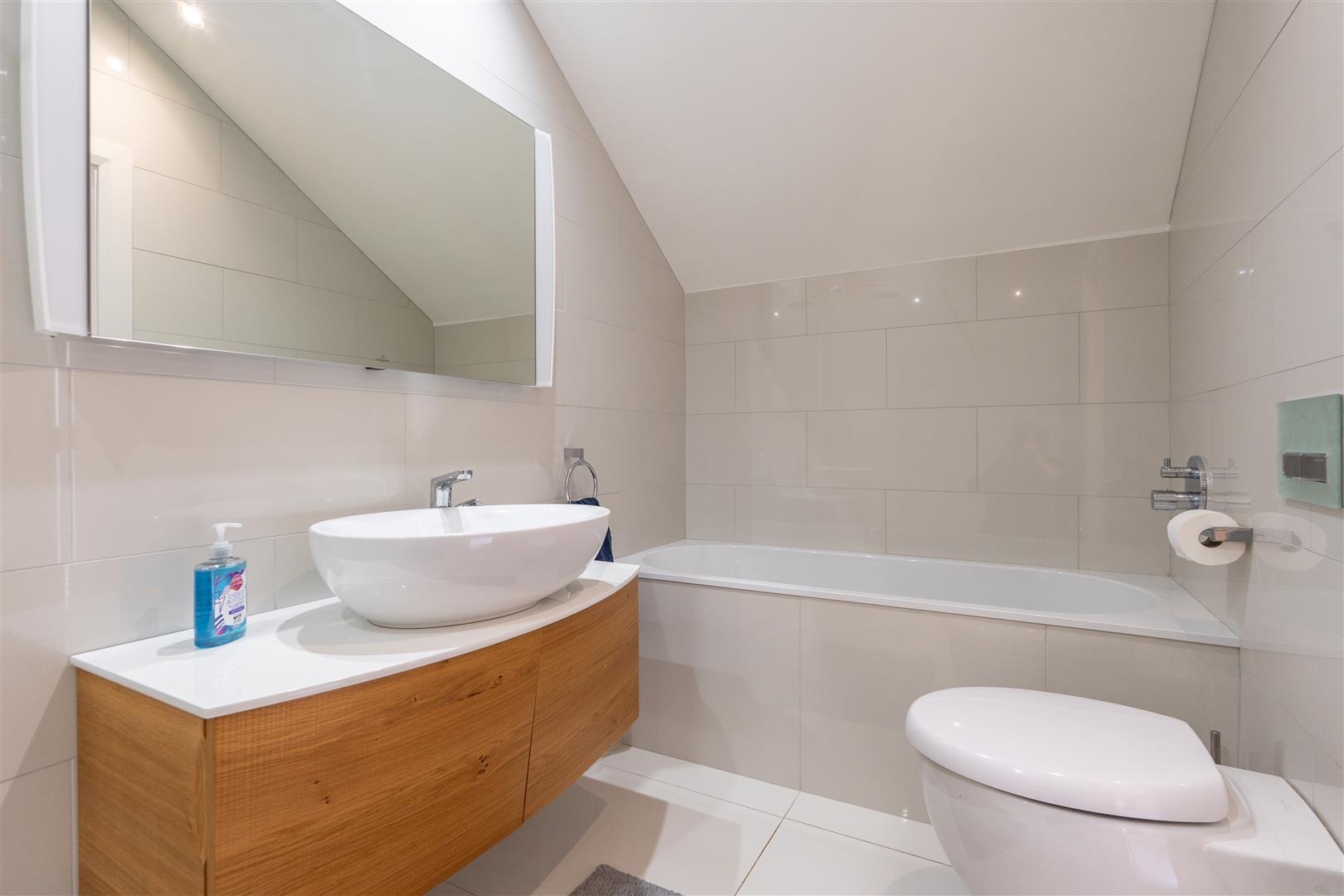 Stunning white suite comprising tiled panel bath with Hansgrohe mixer tap; wall mounted wc with concealed cistern; wash hand basin with mono mixer tap and vanity unit under; walk-in shower with Hansgrohe thermostatically controlled shower unit with wall mounted telephone shower attachment and drench shower head over; glass shower screen; chrome towel radiator; tiled walls and floor; recessed spotlighting; extractor fan.
