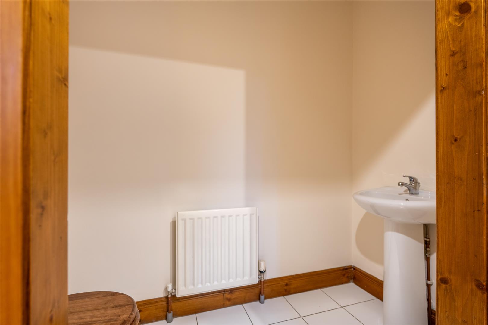 White suite comprising close coupled wc and pedestal wash hand basin with mono mixer tap; tiled floor; recessed spotlights; extractor fan;