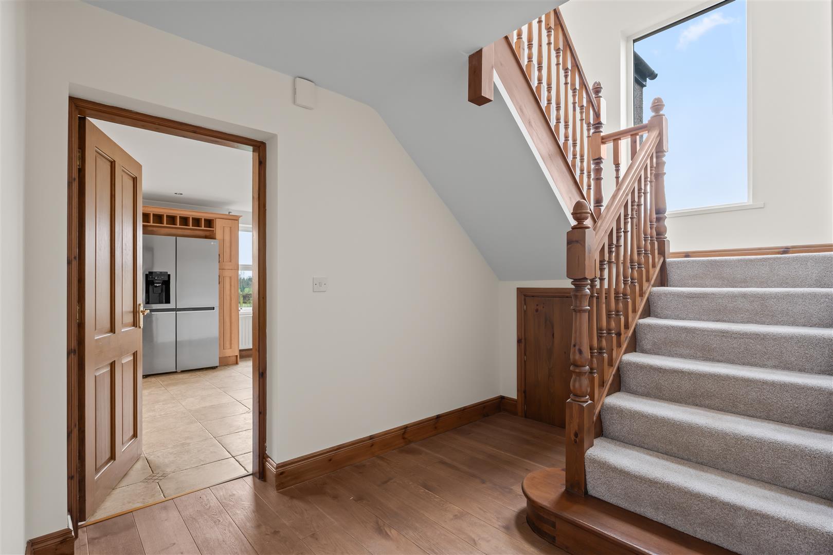 Glazed upvc entrance door; wood laminate floor; understairs storage cupboard;