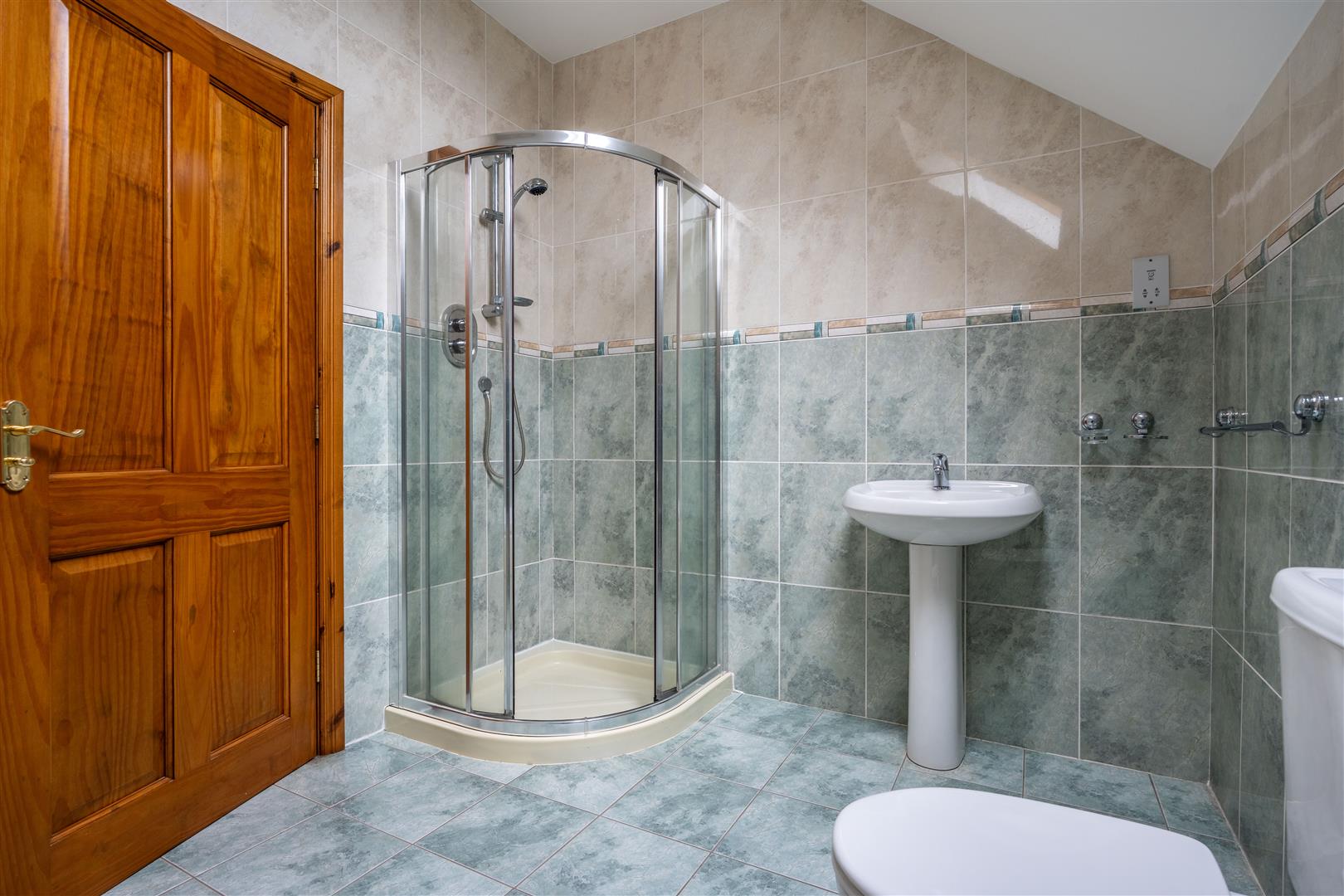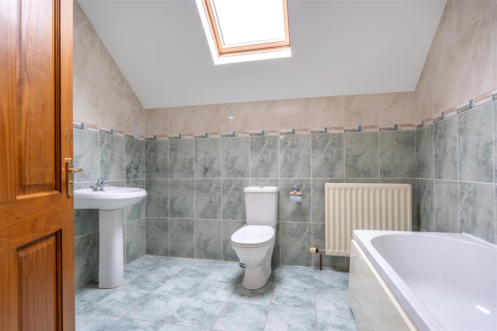 White suite comprising panelled bath with mono mixer tap; tiled shower cubicle with thermostatically controlled shower attachment and wall mounted telephone shower attachment fitted sliding shower doors; close coupled wc; pedestal wash hand basin with mono mixer tap; tiled walls and floor; velux window; recessed spotlights;