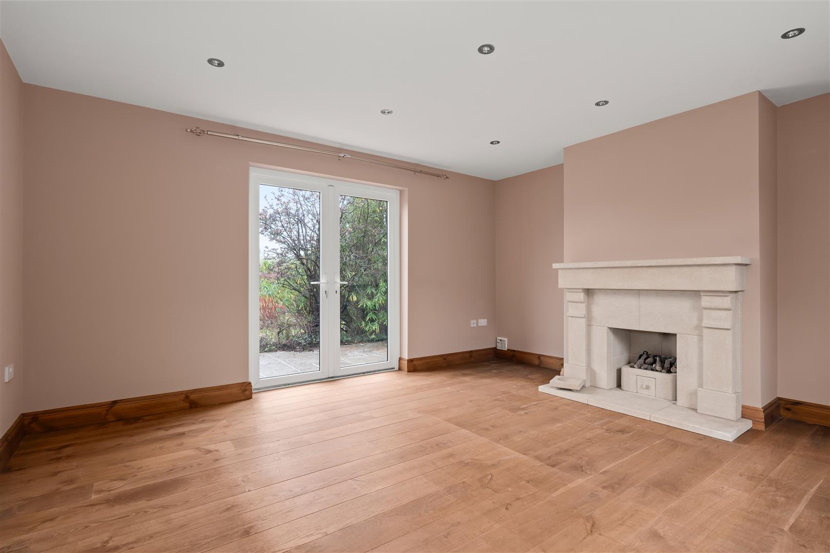 Beautiful sandstone fireplace with matching hearth; gas fire inset; wood laminate floor; recessed spotlights; tv aerial connection point; glazed double upvc doors to rear;