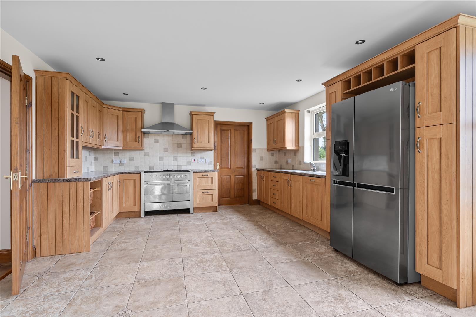 Range of oak high and low level cupboards and drawers with matching glazed display cupboards and incorporating 1½ tub stainless steel sink unit with mixer tap; Tecnik range cooker with 5 ring gas hob (for convenience only and will not be repaired or replaced by landlord during tenancy); Tecnik extractor hood over; American style fridge / freezer; Kenwood dishwasher; laminate worktops; tiled splashback; tiled floor; Ingelnook style fireplace with multi-fuel burning stove; pine mantel over; steps down to:-