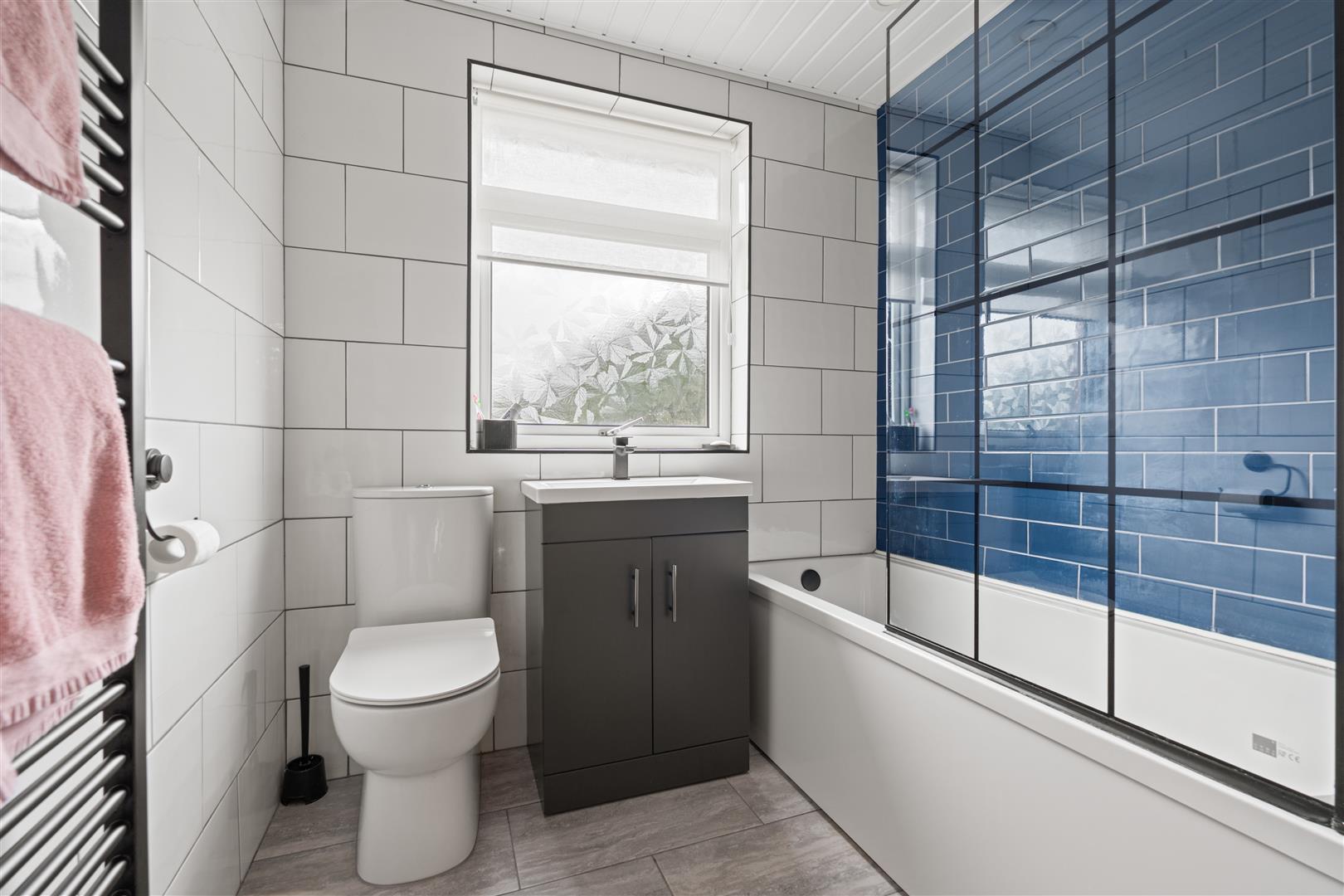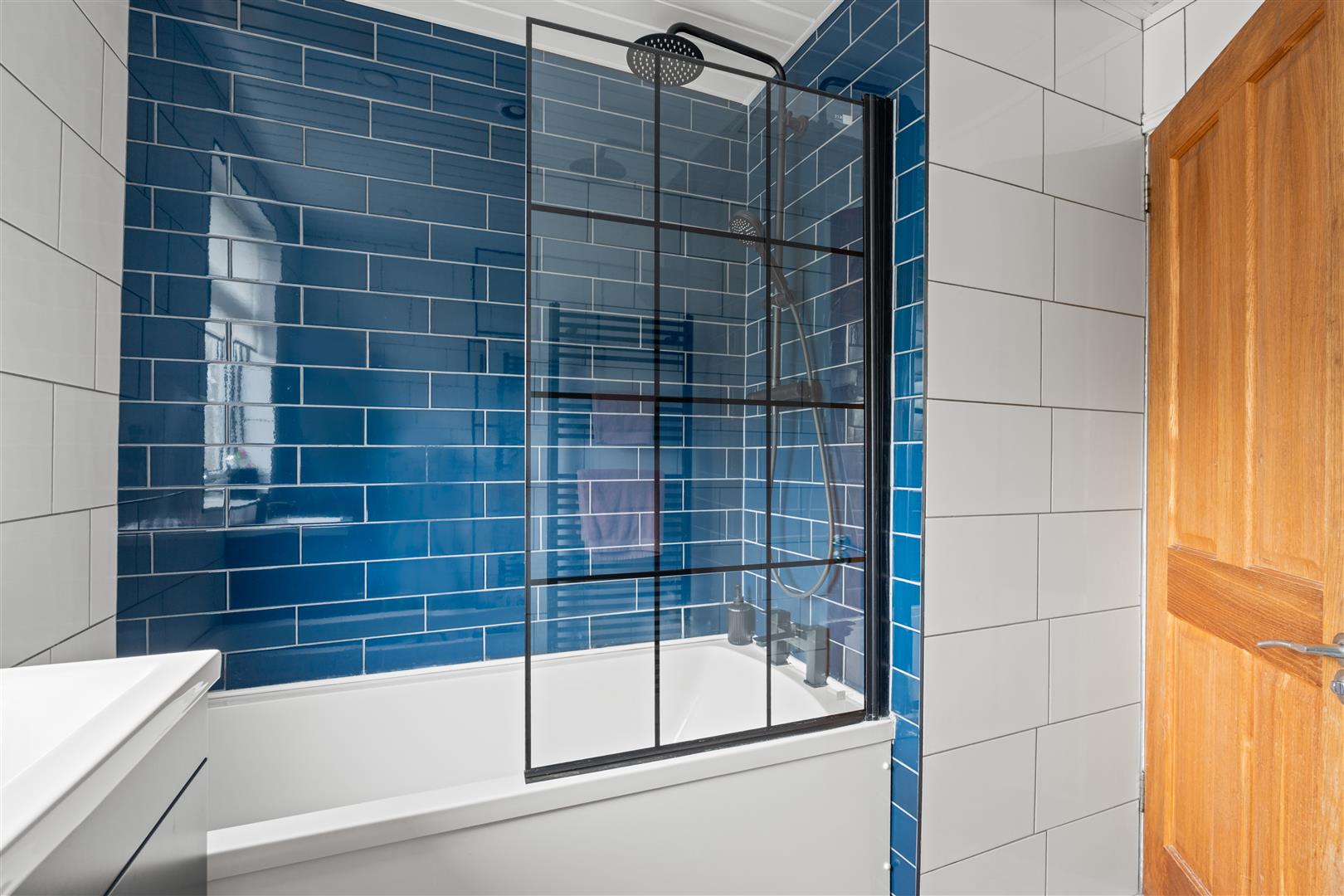 Stunning white suite comprising panelled bath with black pillar mixer tap; thermostatically controlled shower unit with wall mounted telephone shower attachment and drench shower head over; glass shower screen; close coupled wc; wall mounted wash hand basin with mono mixer tap and vanity unit under; tiled floor and walls; Pvc tongue and groove ceiling; towel radiator; access to roofspace.
